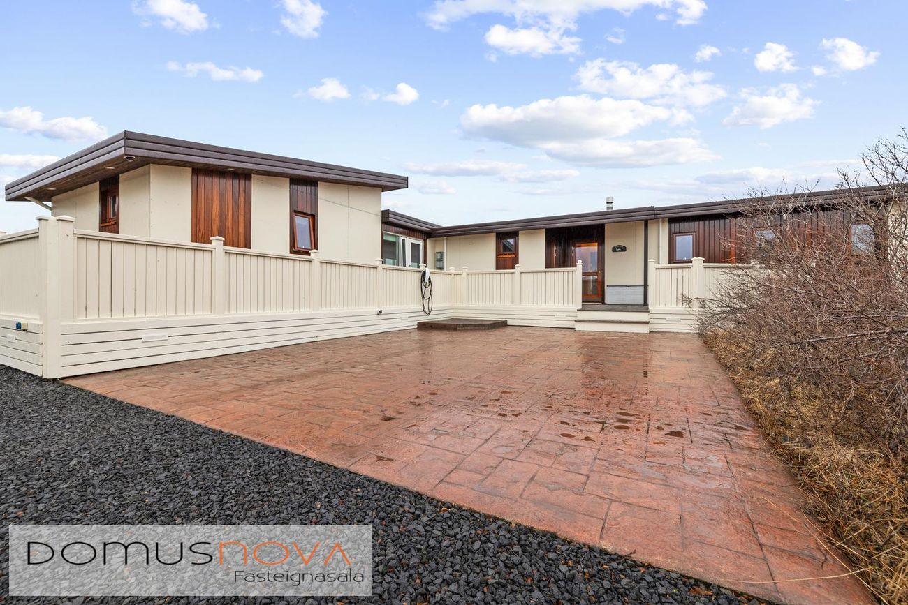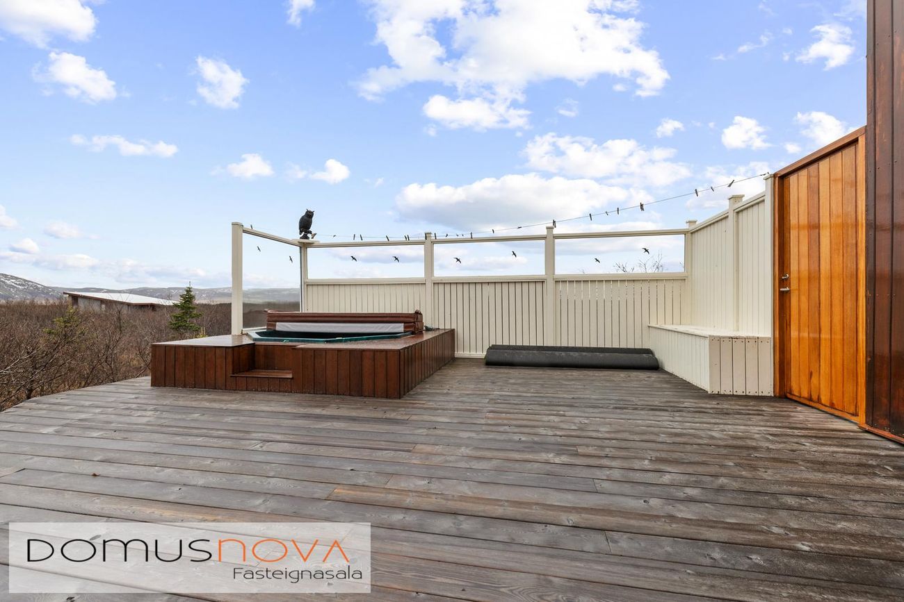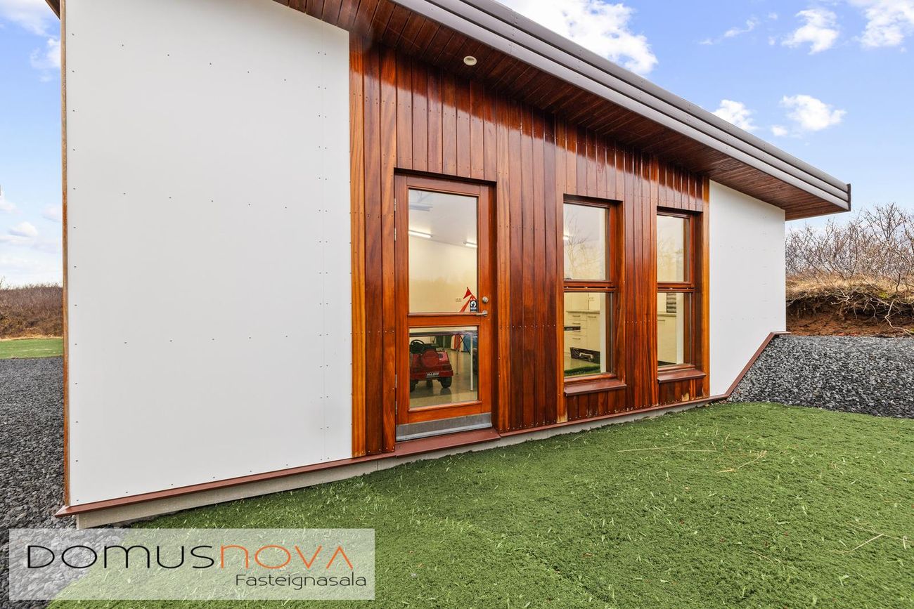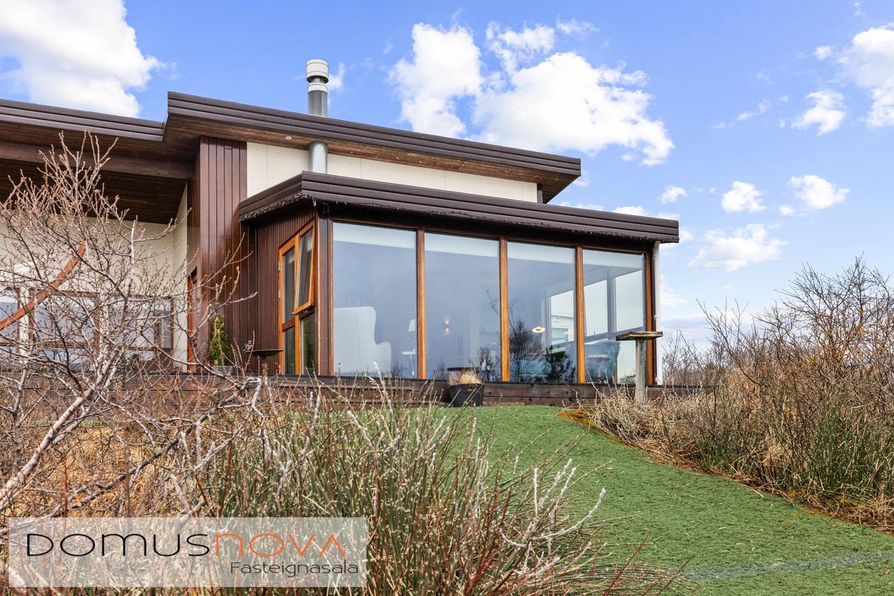 Eignin er reist úr timbri með aukinni þykkt i útveggjum og klædd viðhaldsléttum efnum á ytra birði, báðar klæðingagerðir eru harðviður (Jatoba viður og Duropal harðpressaðar plötur). Allir gluggar eru einnig úr harðvið. Stór verönd, u.þ.b. 200fm, er úr harðvið (Lerki). Vandaðir skjólveggir eru hringinn í kringum húsið, en þó ekki að sunnan og vestanverðu, þannig er hægt að njóta útsýnis úr gólfsíðum gluggum eignarinnar á alla náttúru og landslag sem við blasir. Vandaður heitur pottur með hitastýringu er frá framleiðandanum Trefjar.