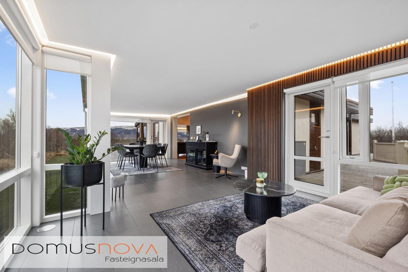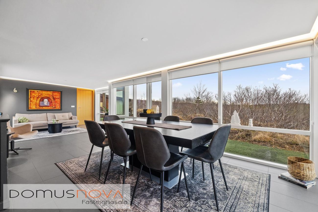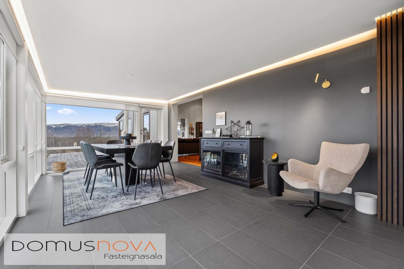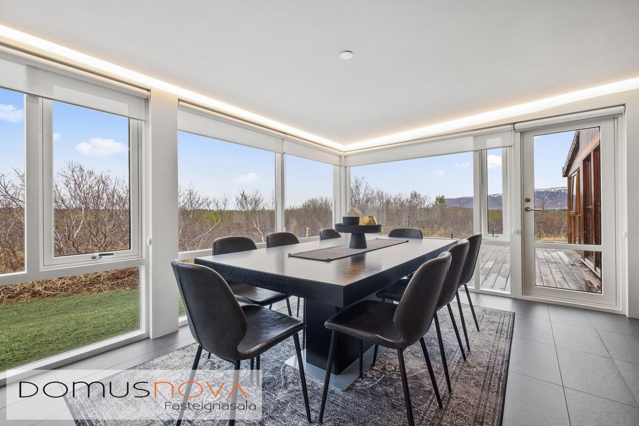 Borðstofan var byggð 2022 og er öll með gólfsíðum gluggum.Sólstofa er um 20fm með dökkum flísum, einnig mjög