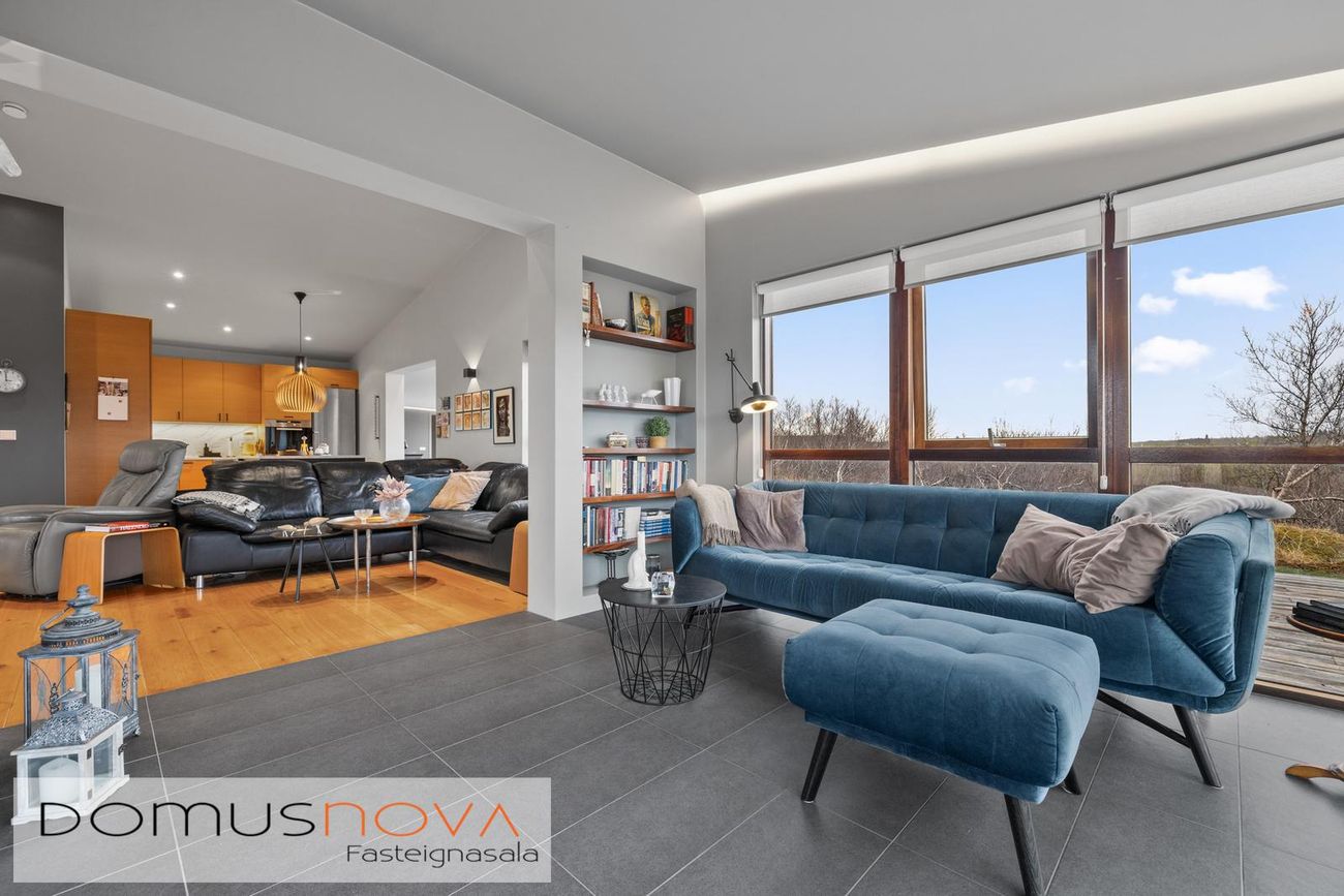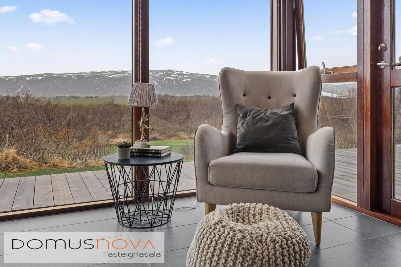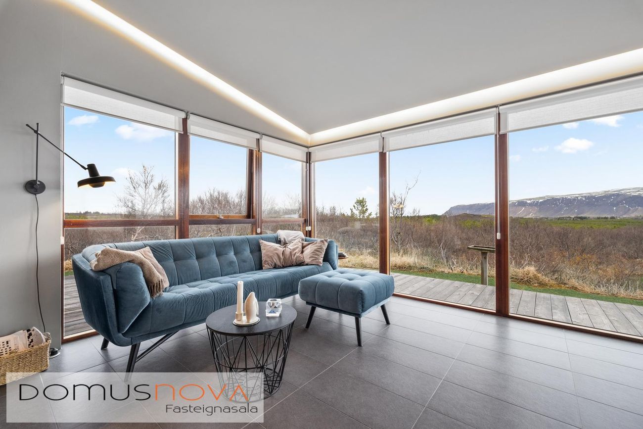 Gólfsíðir gluggar eru í allri sólstofunni með glæsilegt útsýni á náttúru og landslag, þ.m.t. allt Skógræktarsvæðið sem blasir við.