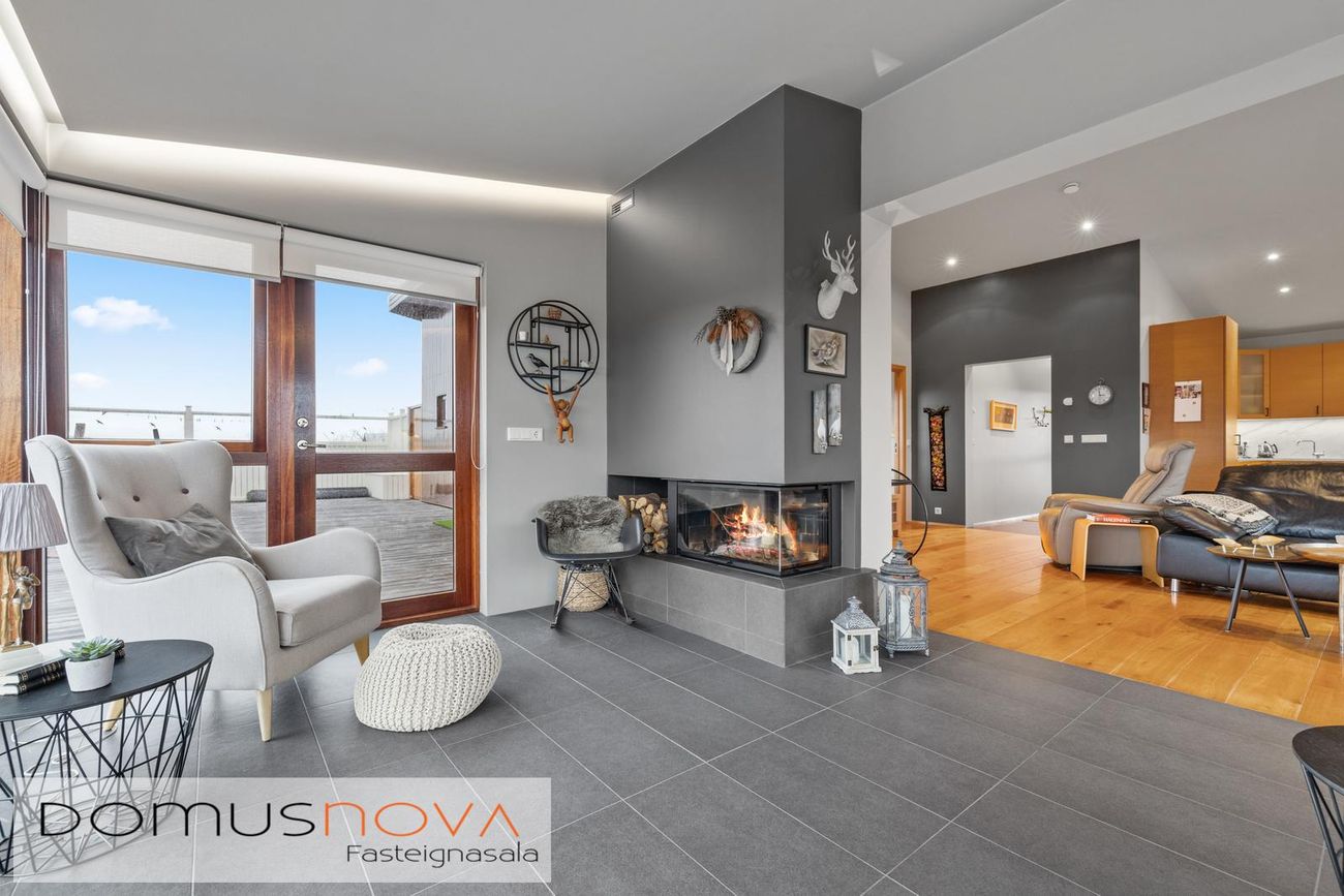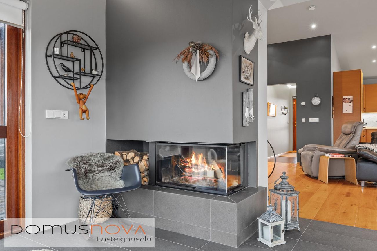 vandaður arinn frá Funa og er hann flísalagður í stíl við gólfin. Útgengt úr sólstofu á stóran pall til suðurs og vesturs.