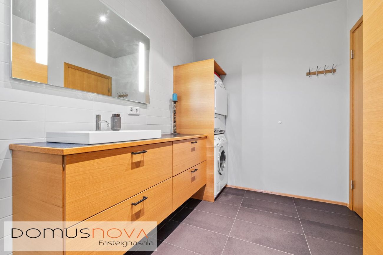 Inntök rafmagns og vatns eru í flísalagðri geymslu með góðu aðgengi. Gluggi er á geymslu ásamt góðu hilluplássi.