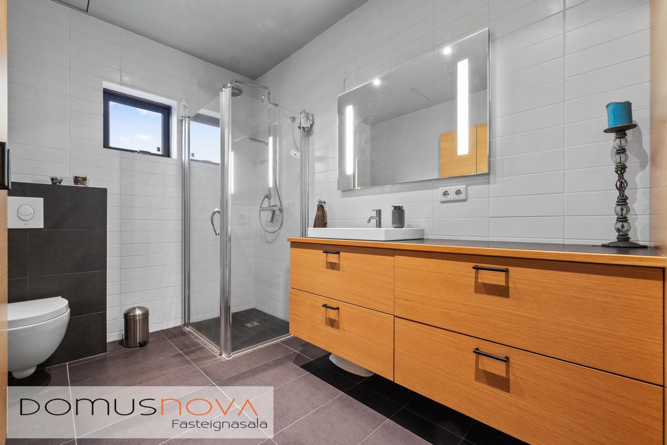 dökkum 30x60cm flísum, stór fataskápur ásamt óbeinni lýsingu í loftum. Einnig er innfelld Led lýsing í lofti og eru báðar lýsingar með dimmer.