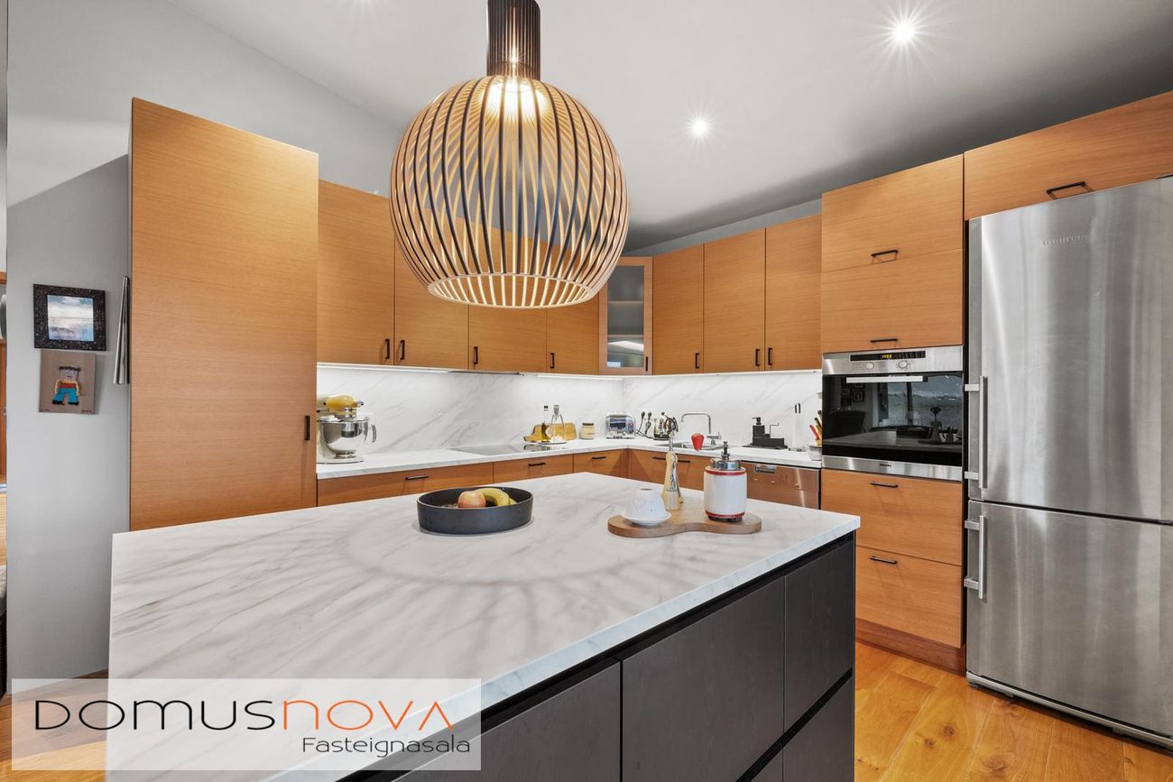 sérsmíðaðri innréttingu ásamt stórri eyju með miklum hirslum.