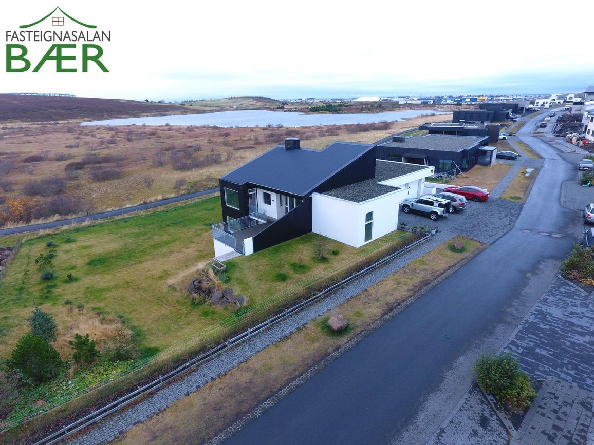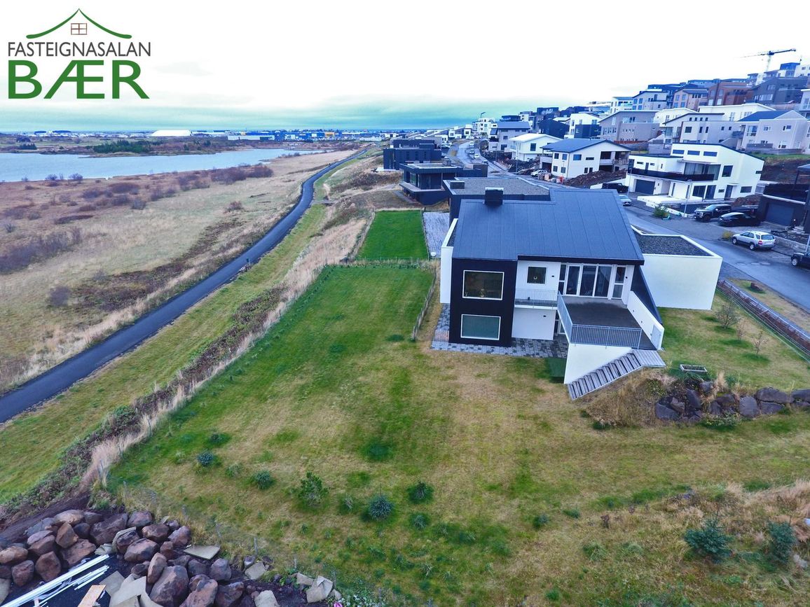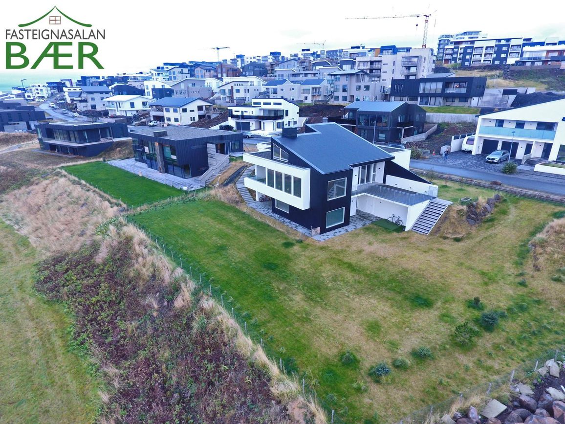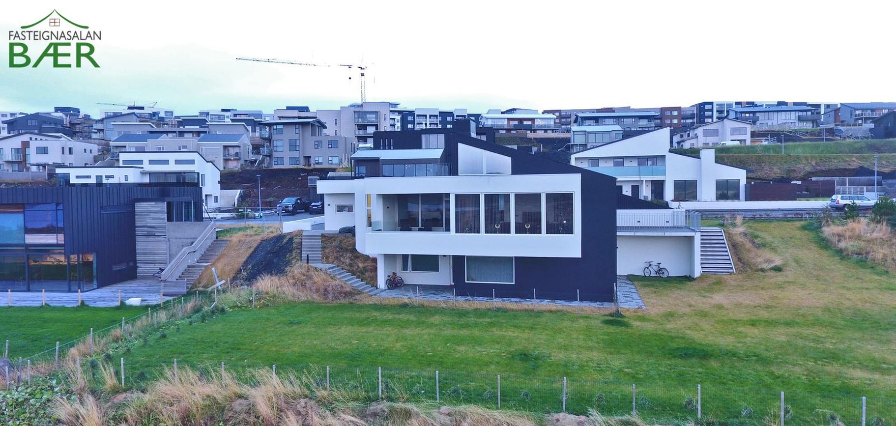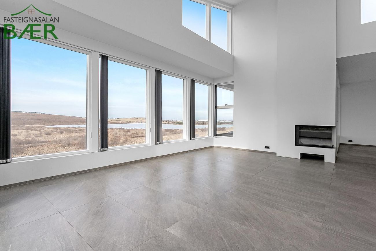 396,7 fm hús með þreföldum bílskúr á 1.594 fm lóð. Lykilatriði: gólfhiti, jarðvarmi, öryggiskerfi, hágæða flísalagnir, sérsmíðað eldhús og þríglasaðir gluggar.
