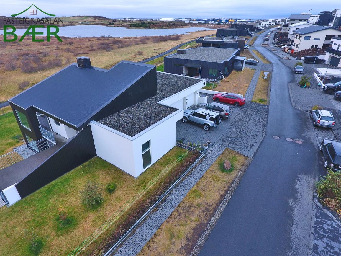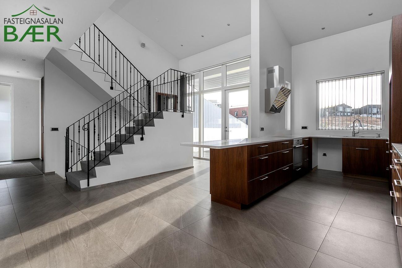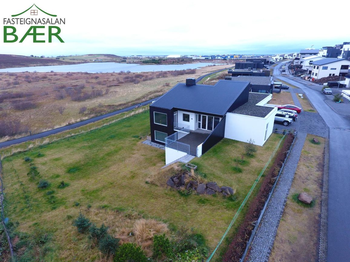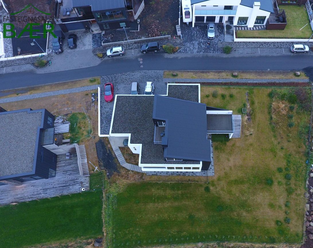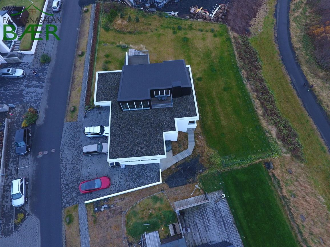 396,7 fm hús með þreföldum bílskúr á 1.594 fm lóð. Lykilatriði: gólfhiti, jarðvarmi, öryggiskerfi, hágæða flísalagnir, sérsmíðað eldhús og þríglasaðir gluggar.