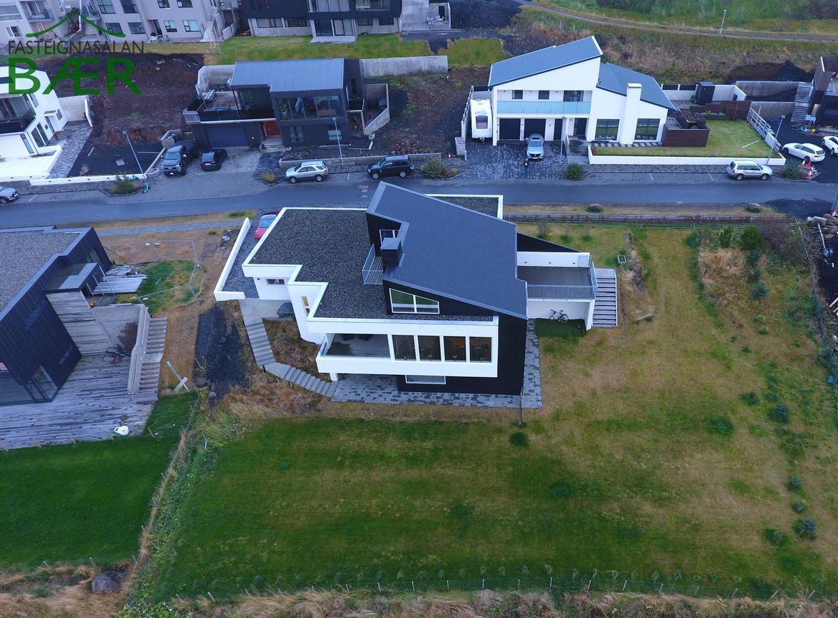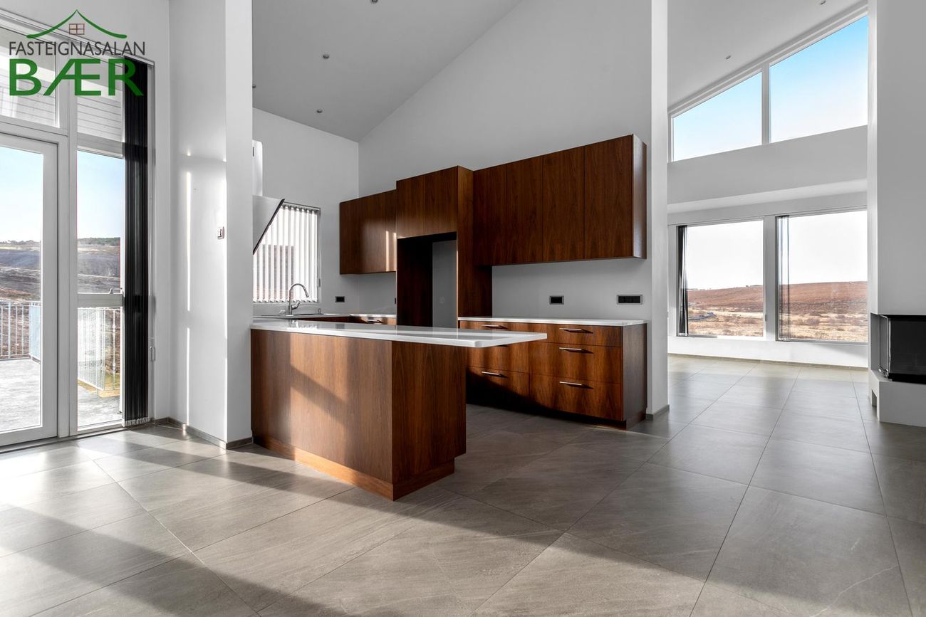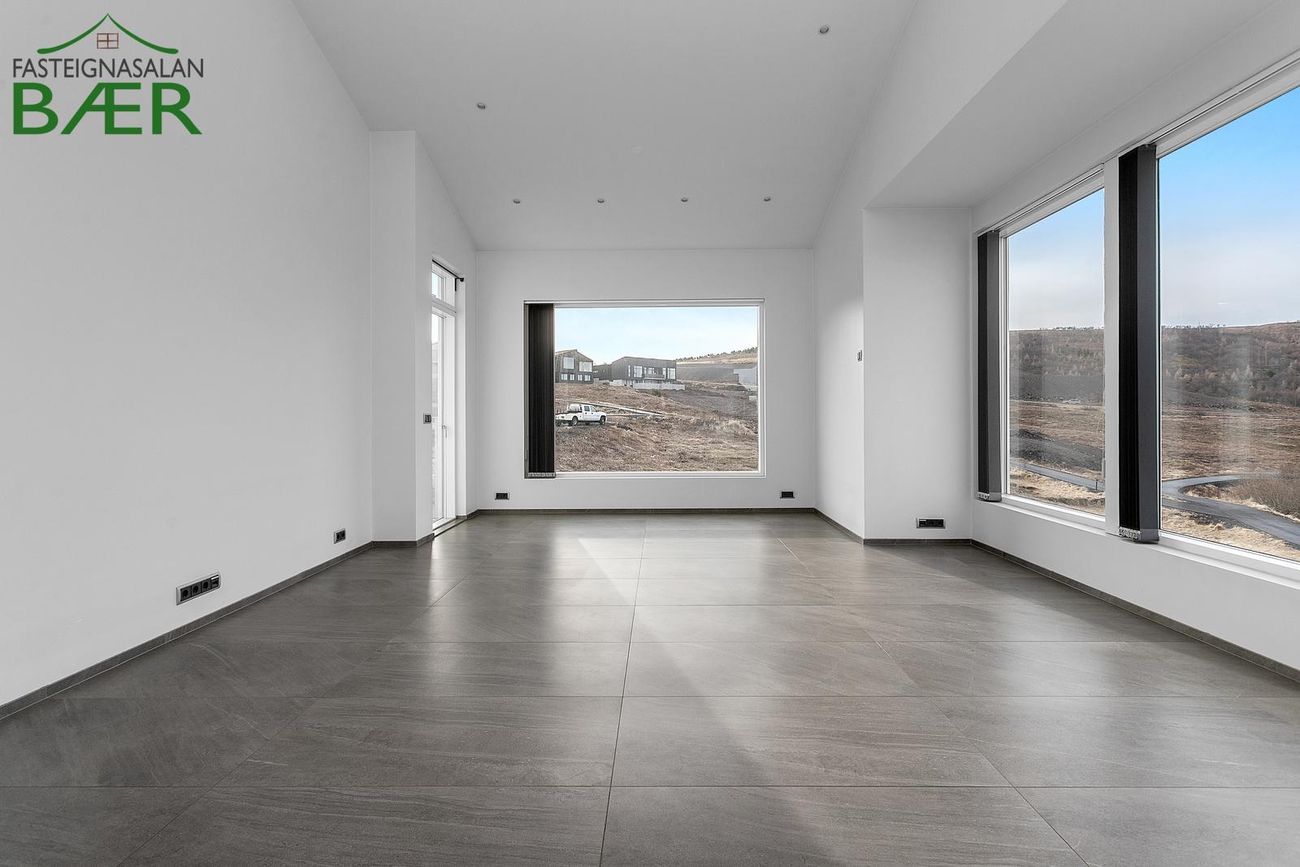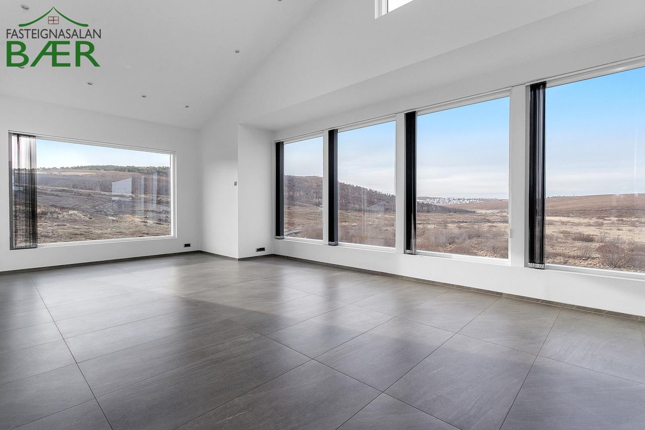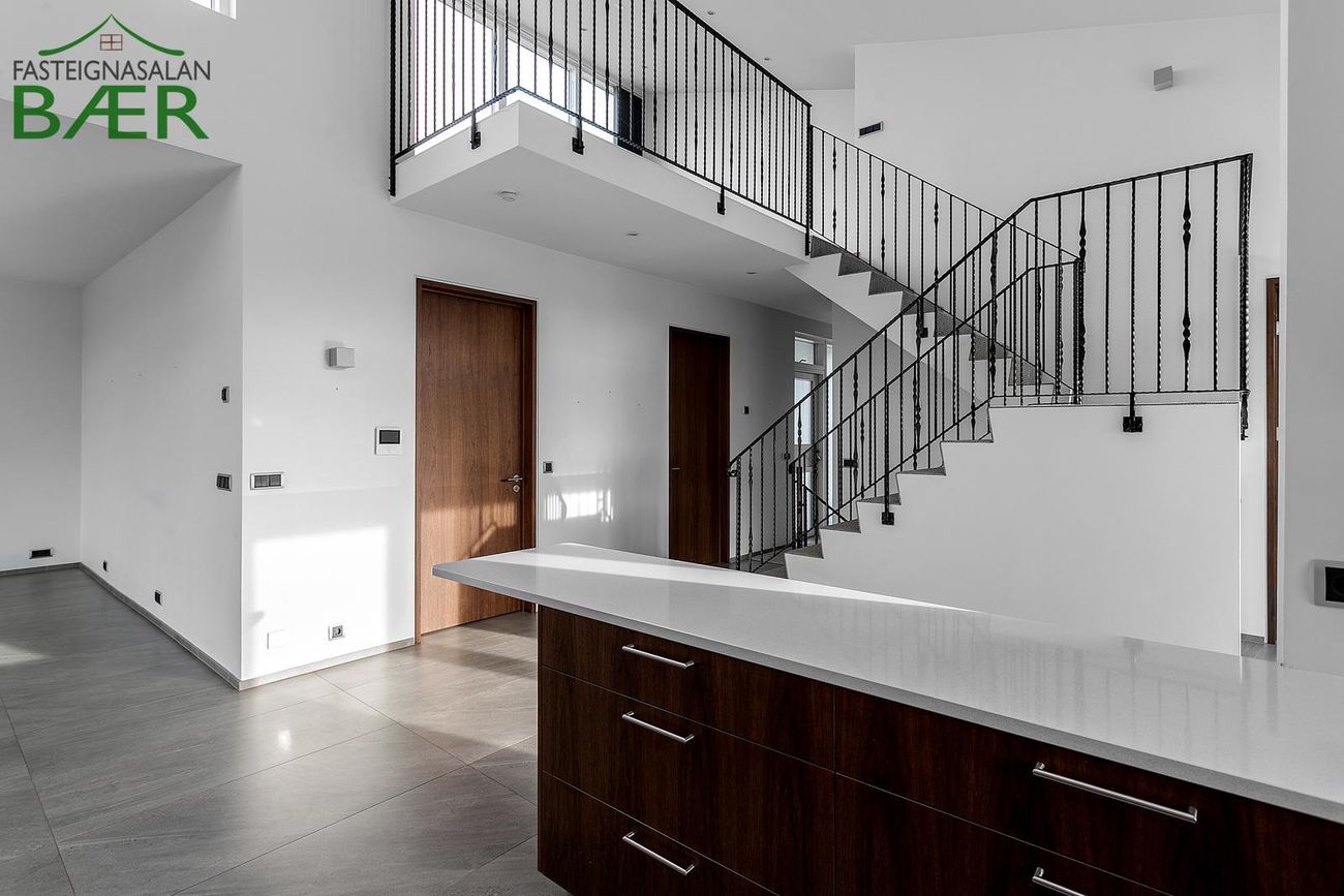 396,7 fm hús með þreföldum bílskúr á 1.594 fm lóð. Lykilatriði: gólfhiti, jarðvarmi, öryggiskerfi, hágæða flísalagnir, sérsmíðað eldhús og þríglasaðir gluggar.