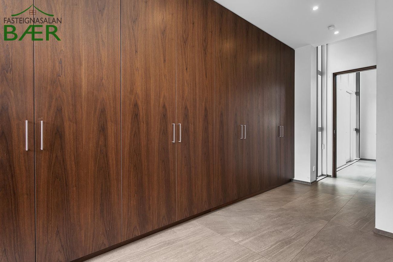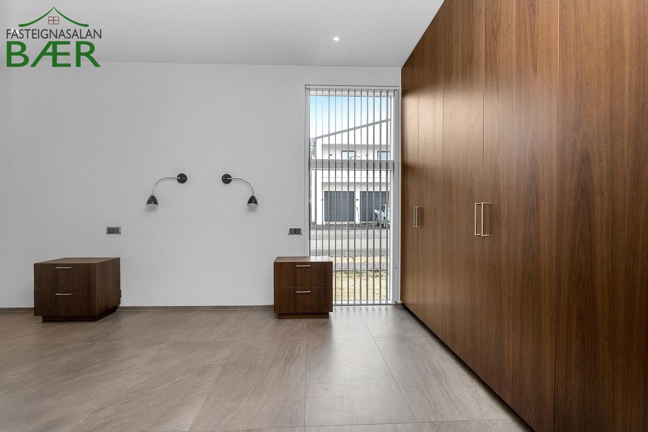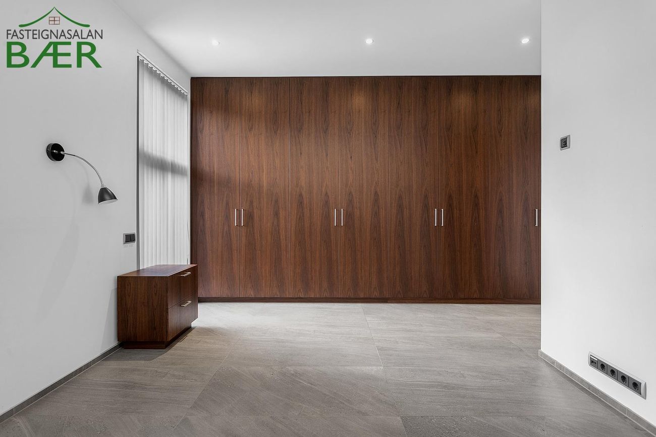 Rýmilegt hjónaherbergi með stórum fataskápum úr hnotu. Neðri hæð með stóru svefnherbergi og fataskáp.