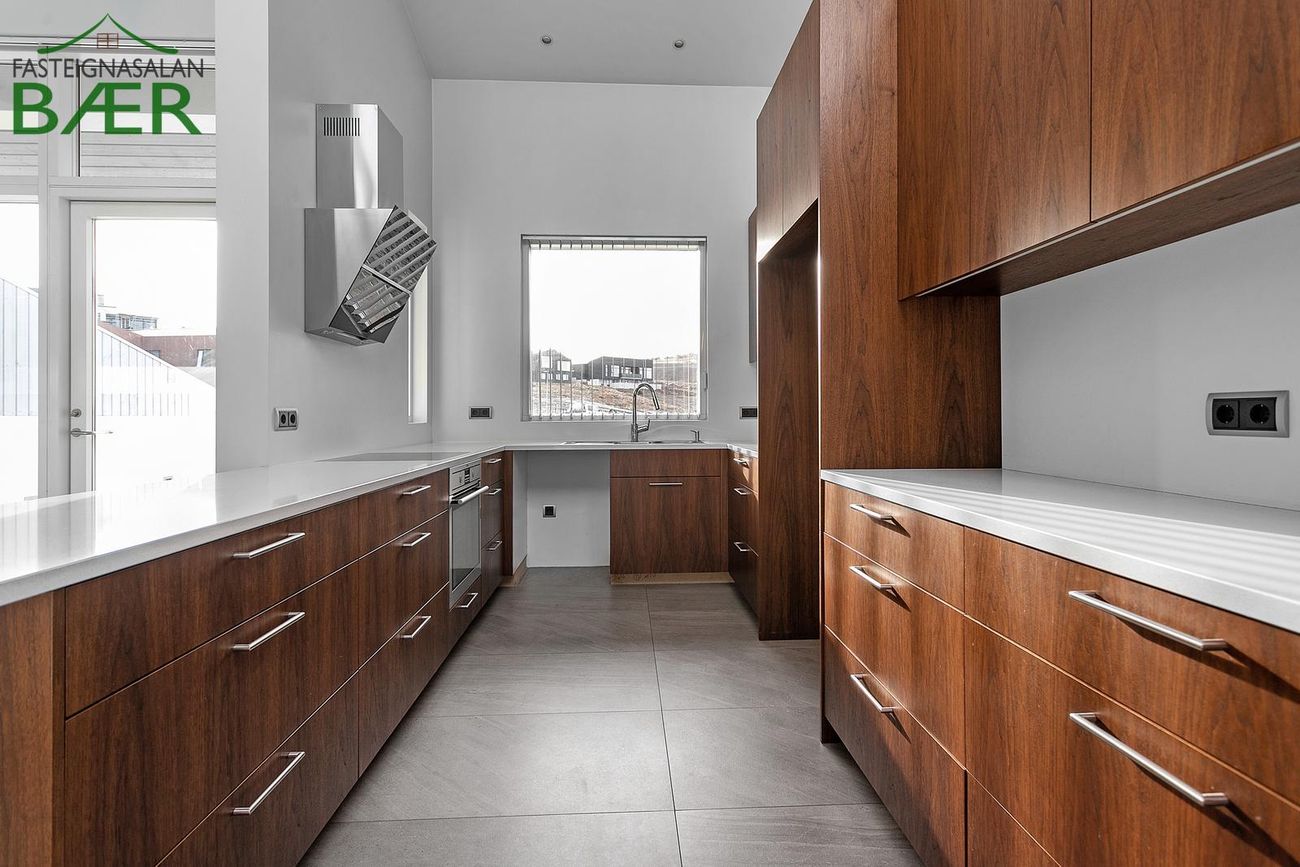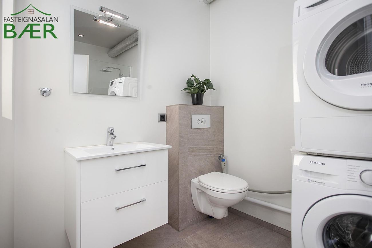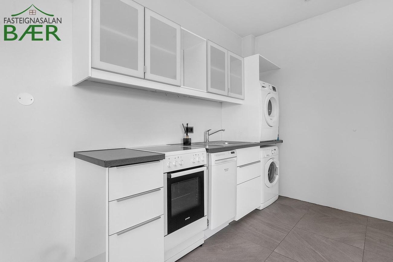 Innbyggð tæki í eldhúsi (uppþvottavél, ísskáp, eldavél). Þvottavél og þurrkari fylgja íbúð á neðri hæð.