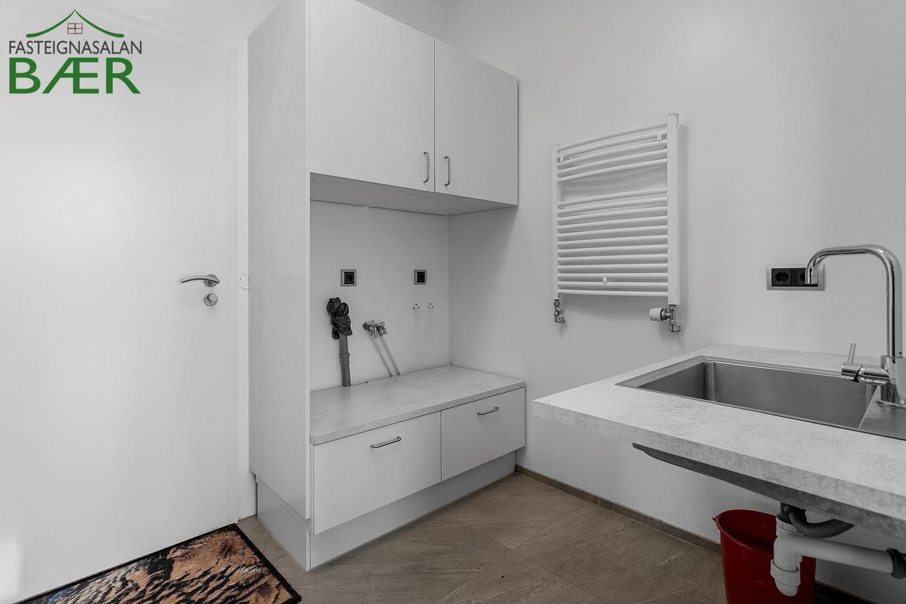 Þvottahús með hvítri innréttingu, skolvaska og tengingu við bílskúr. Þvottavél og þurrkari fylgja íbúð á neðri hæð.