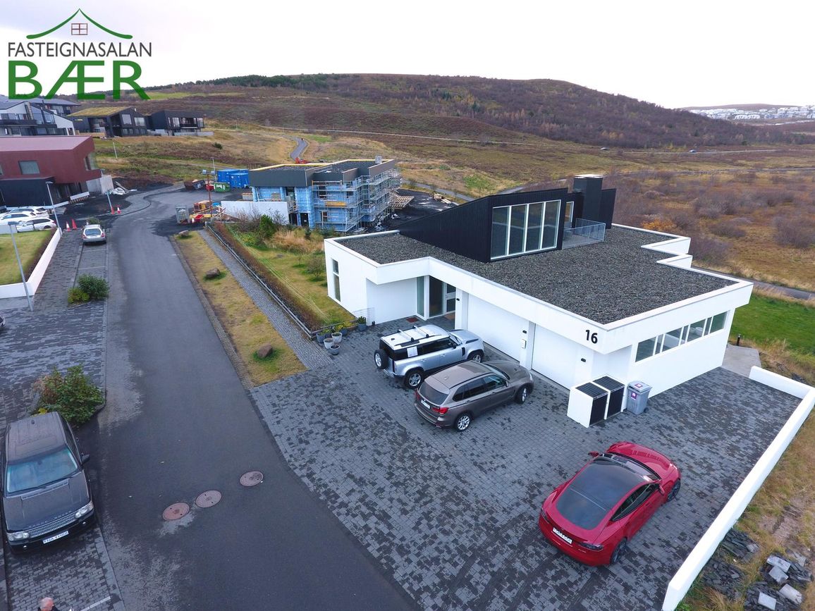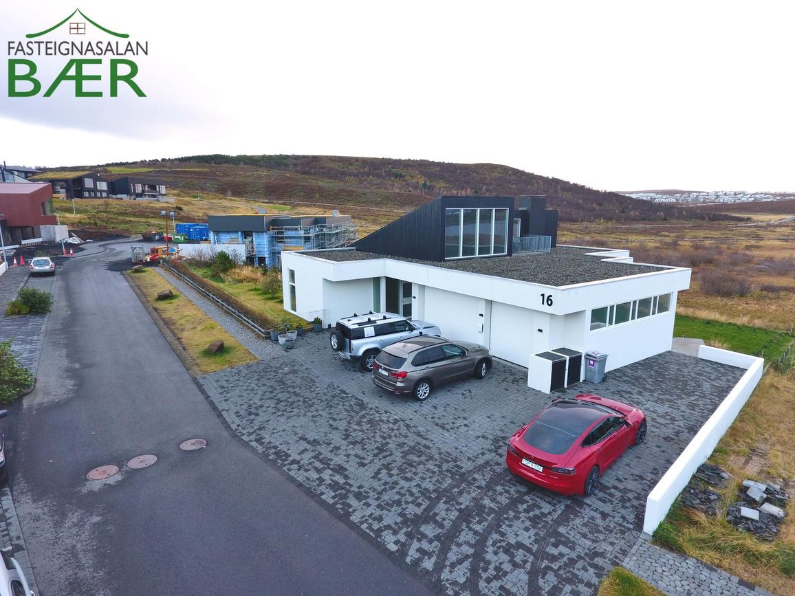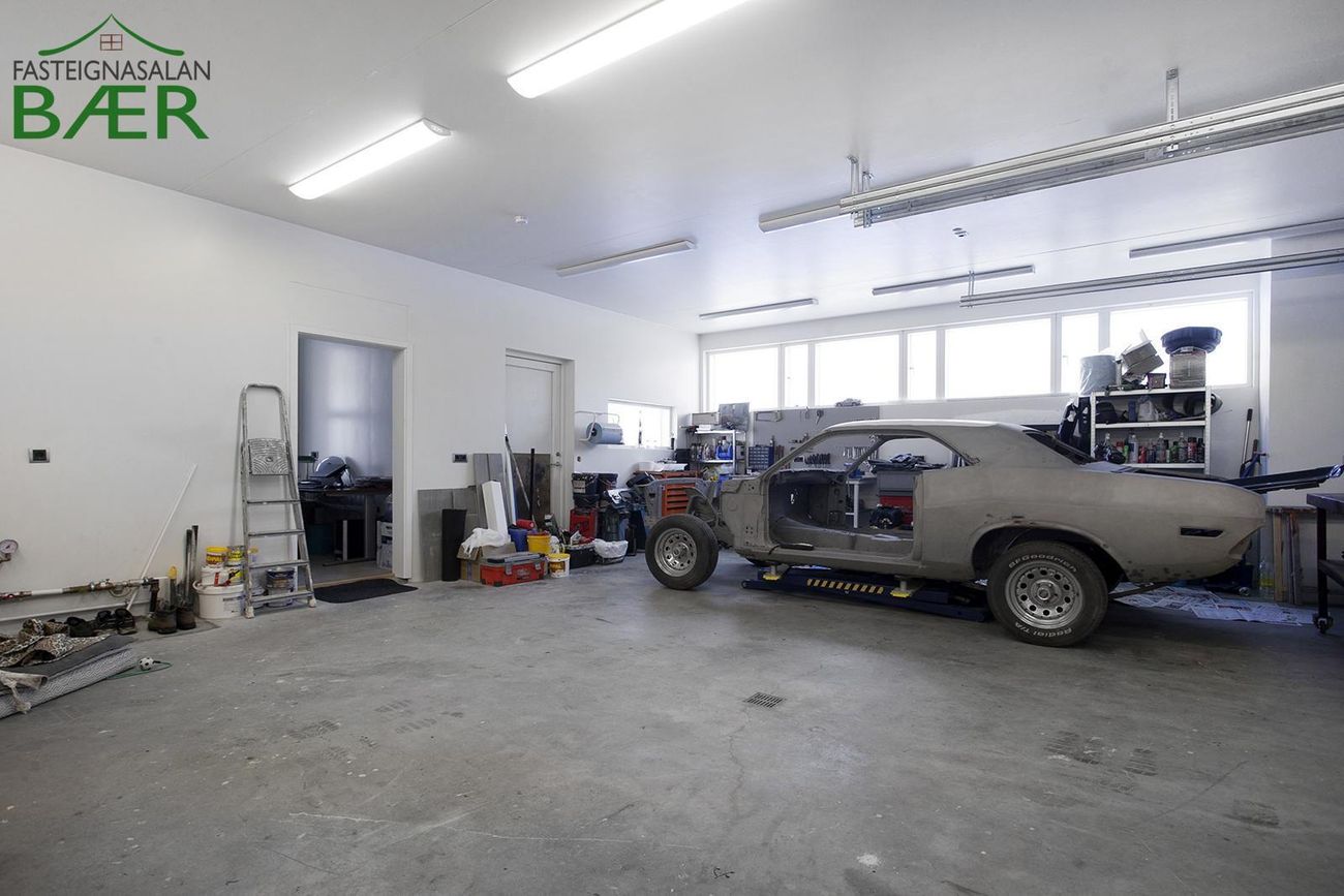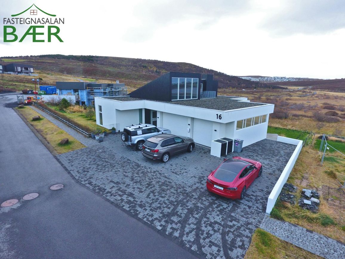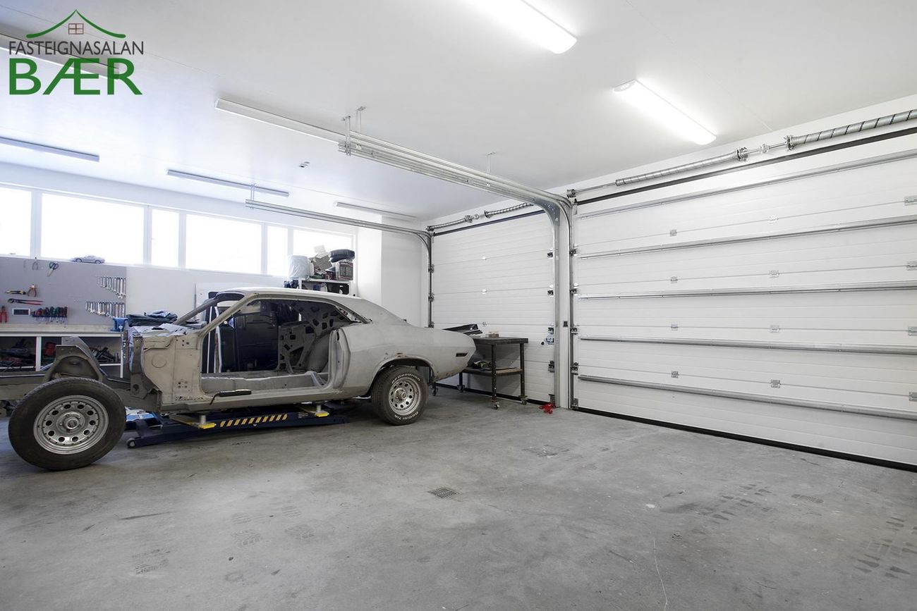 Þrefaldur bílskúr með gólfhita, þriggja fasa rafmagni, ryksugukerfi og tengingu við hleðslustöð fyrir rafbíl. Hellulagt bílastæði með snjóbæðslu.