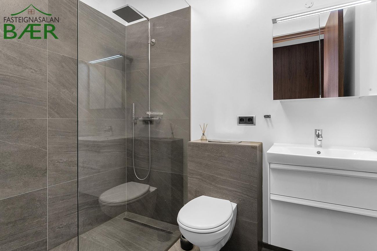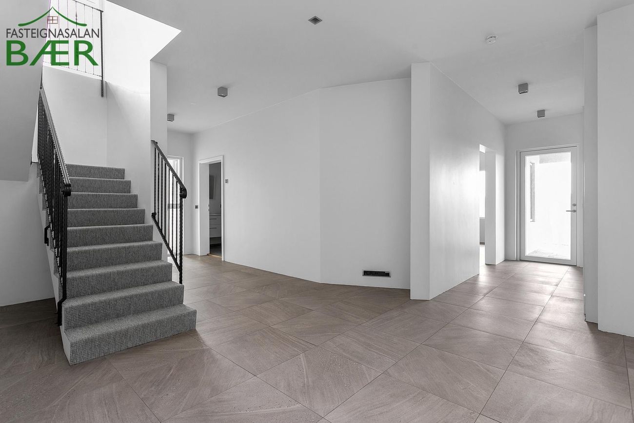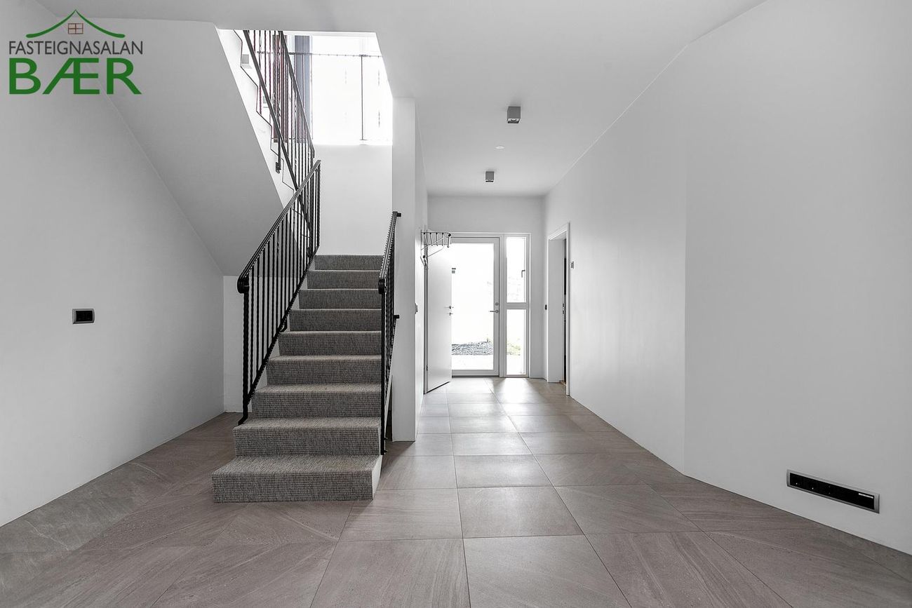 Staðsteypt bygging með 10 cm plasteinangrun, hágæða flísalagnir (Parka), þríglasaðir gluggar (Velfac) og smíðajárnshandrið í stigagangi.