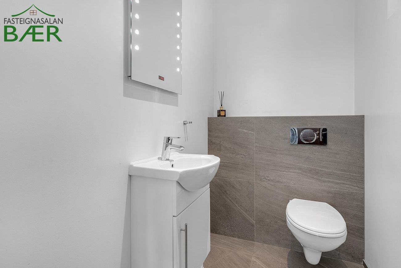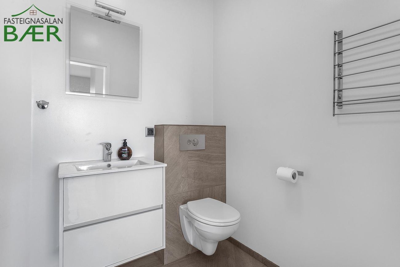 Gestasalerni með hvítri innréttingu, flísalögðu gólfi og hluta veggja.