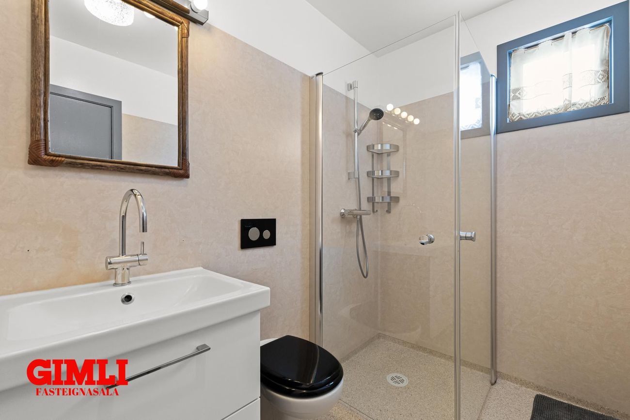 Baðherbergi 2 er inn af hjónaherbergi og það með sturtuklefa, upphengdu salerni og innréttingu. Lítið mál er að bæta við hurð út á gang með því að opna gamalt hurðargat.
