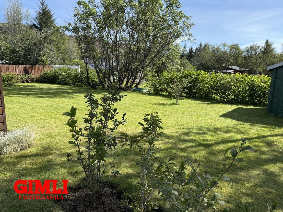 Stór verönd er í sólríkum suðurgarði. Garðurinn er sérlega fallegur og vel hirtur og fjölbreyttur gróður, liggur hann að óbyggðum reit milli húsa sem gerir enn mæra næði í bakgarðinum.