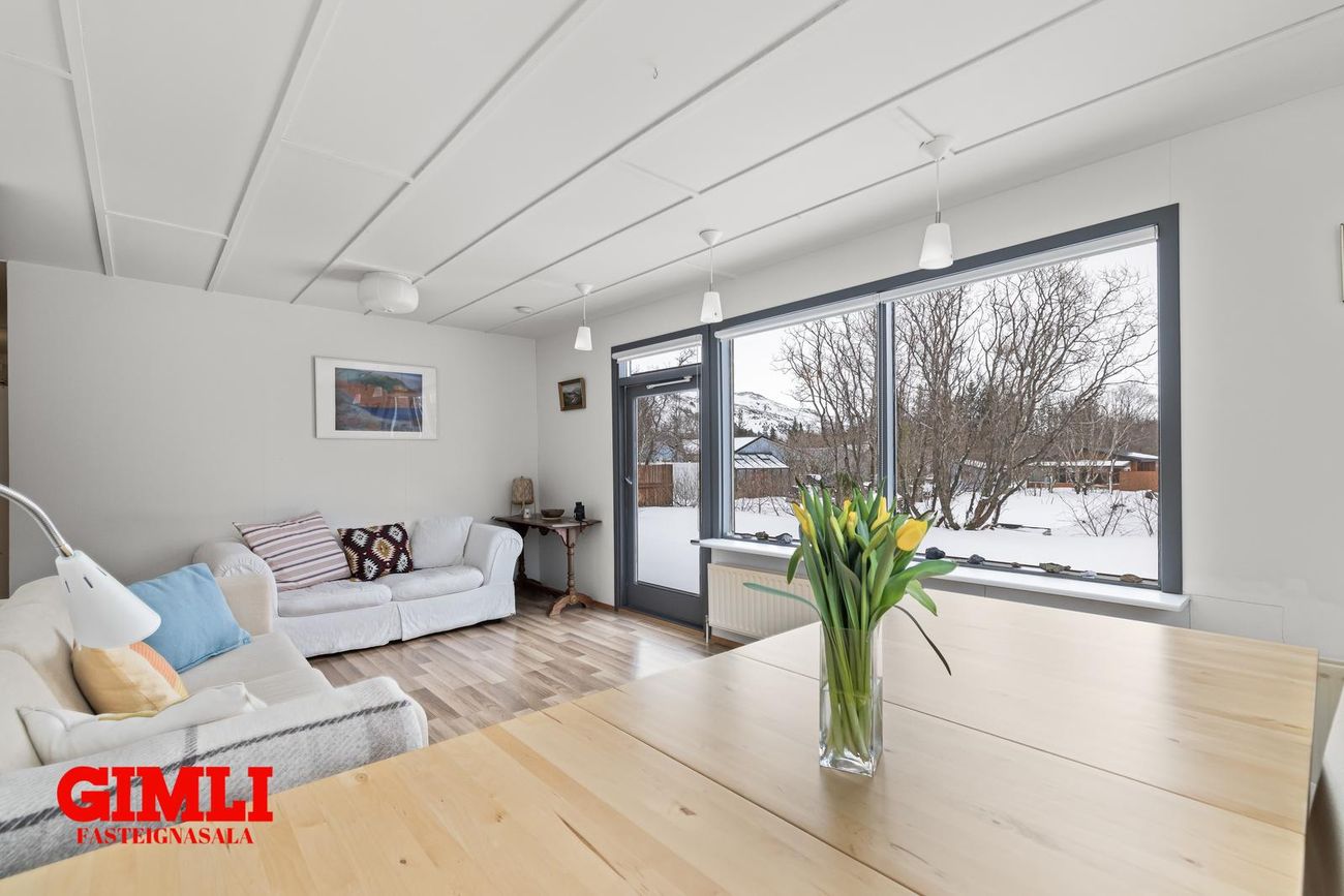 stofa með gluggum á tvo vegu og hurð út á stóra suðurverönd.