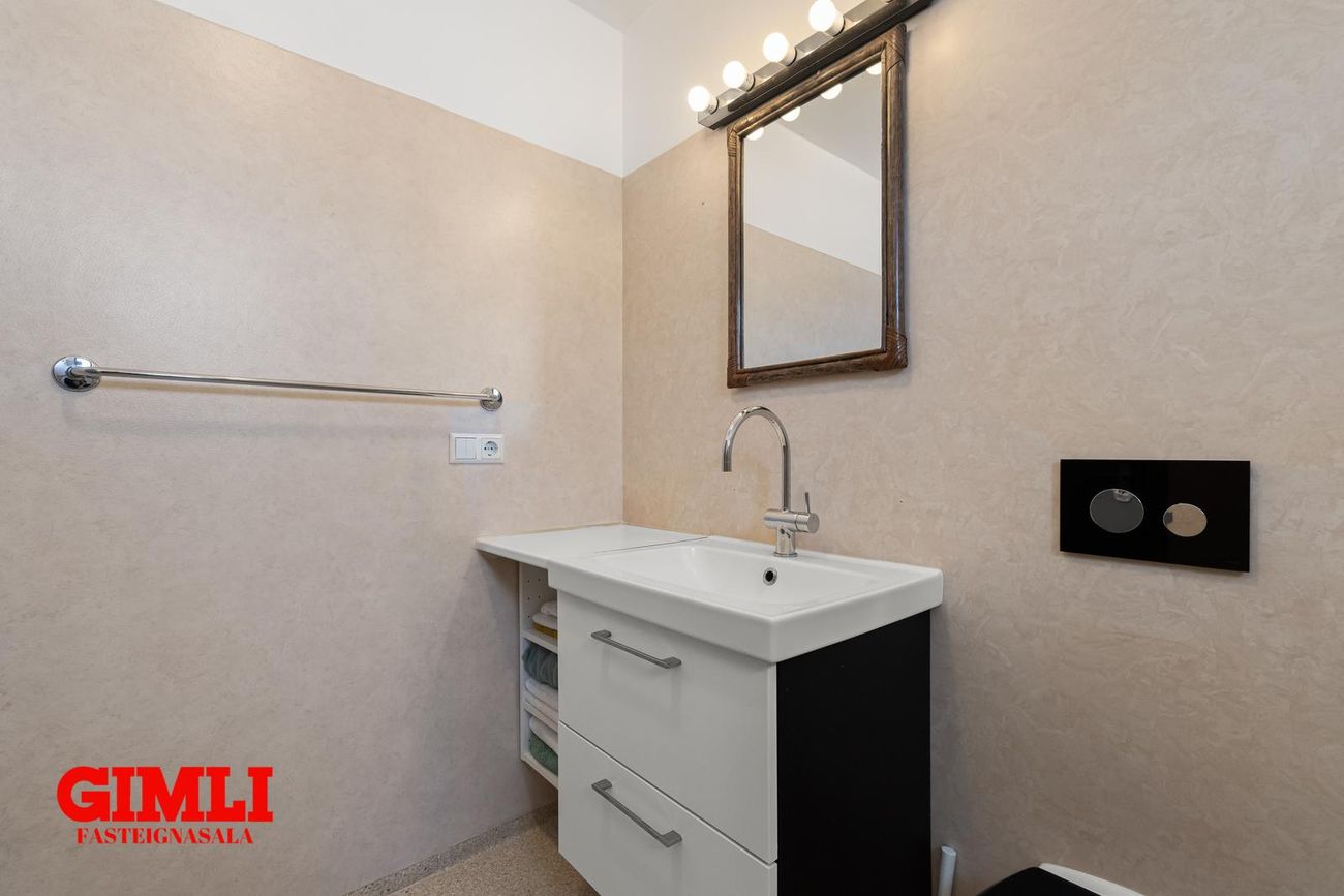 Baðherbergi 2 er inn af hjónaherbergi og það með sturtuklefa, upphengdu salerni og innréttingu. Lítið mál er að bæta við hurð út á gang með því að opna gamalt hurðargat.