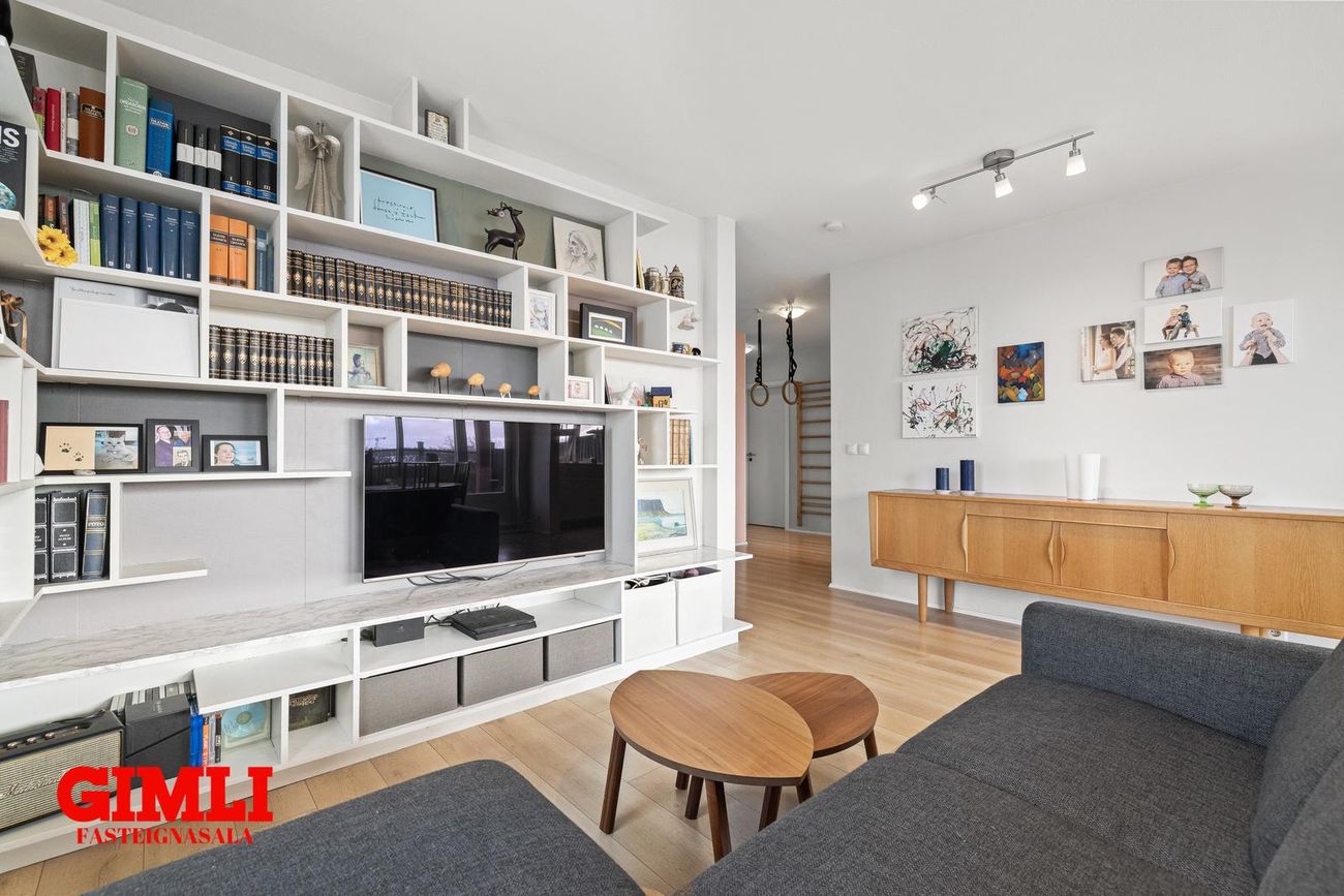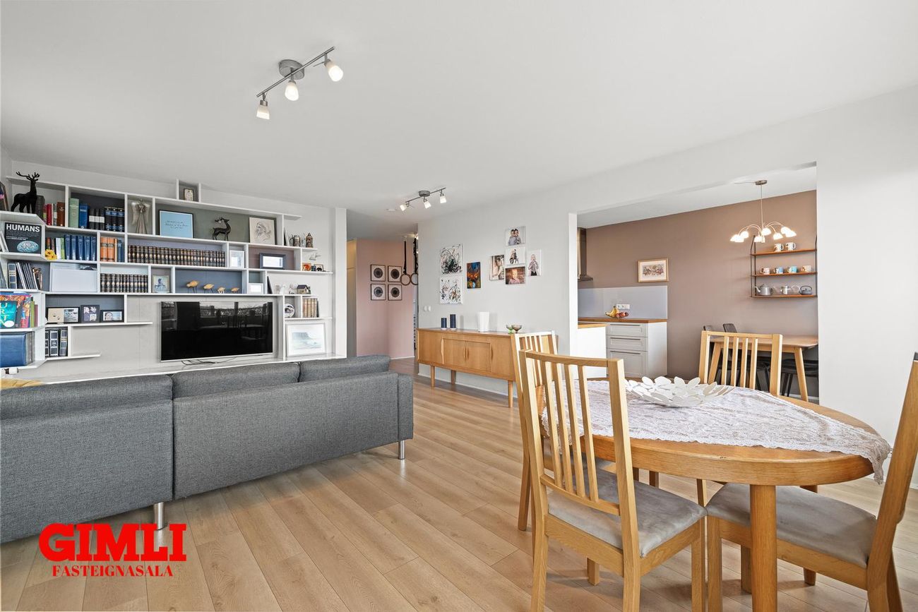 Stofa/borðstofa: mjög rúmgóð í samliggjandi rými. Opið að hluta til í eldhús. Björt og með útgengi á rúmgóðan pall. Sérsmíðuð hillu innrétting í stofu sem fylgir.