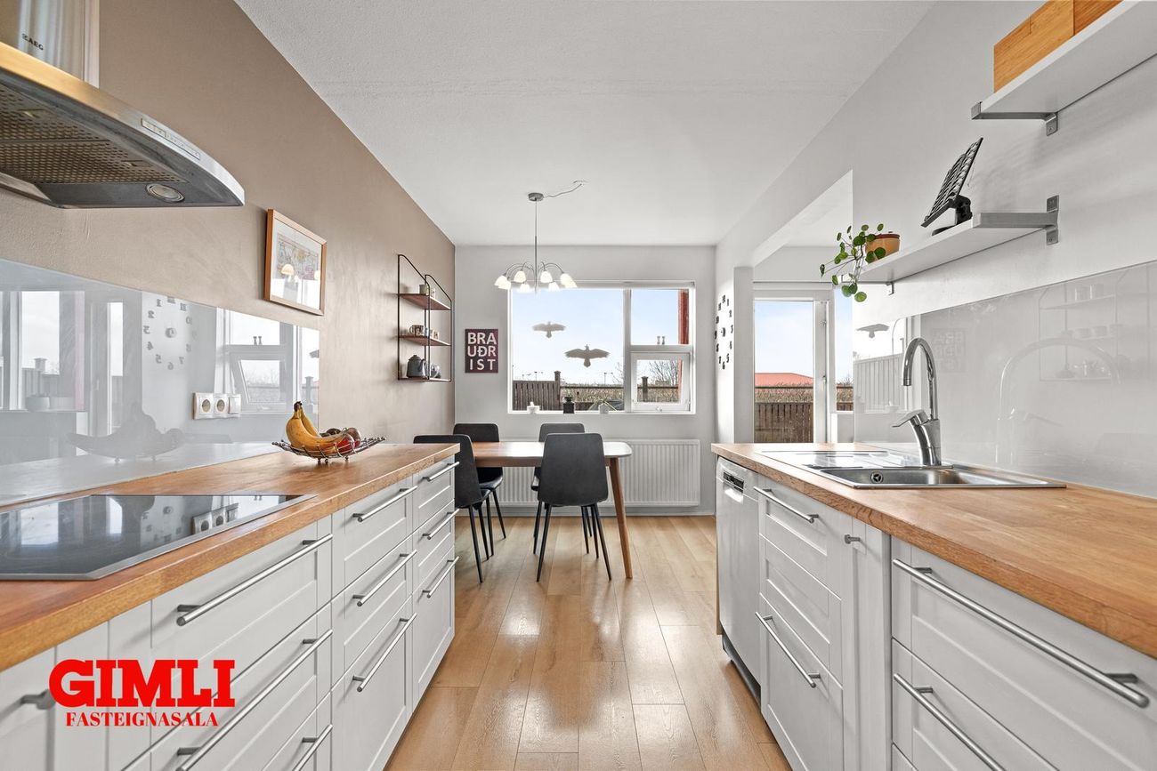 Eldhús: hvít innrétting með viðarborðplötu. Borðkrókur og gluggi.