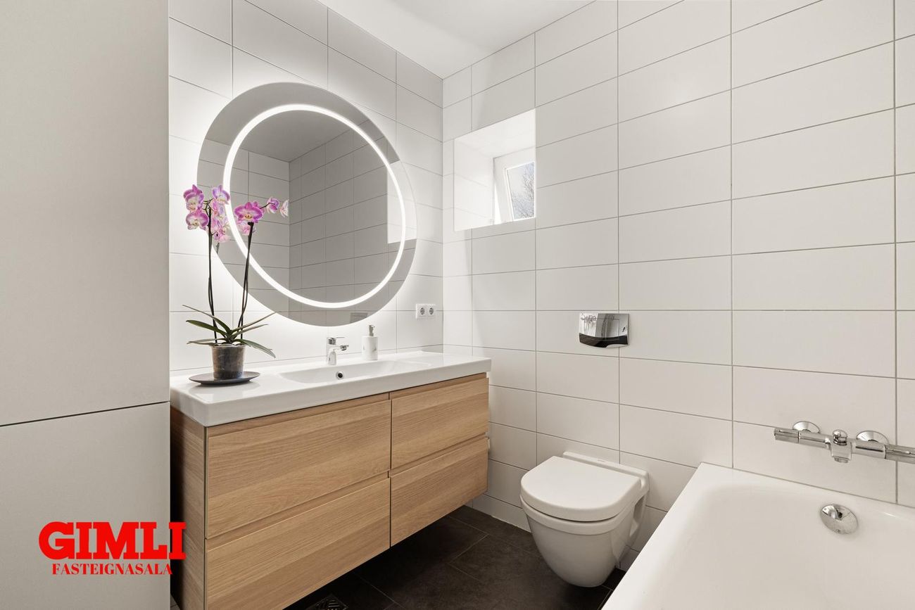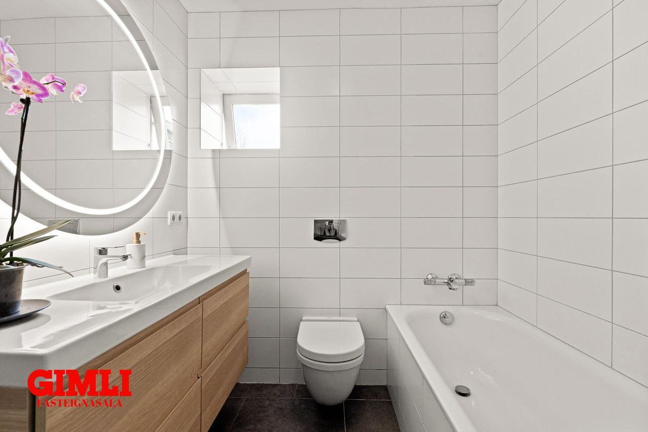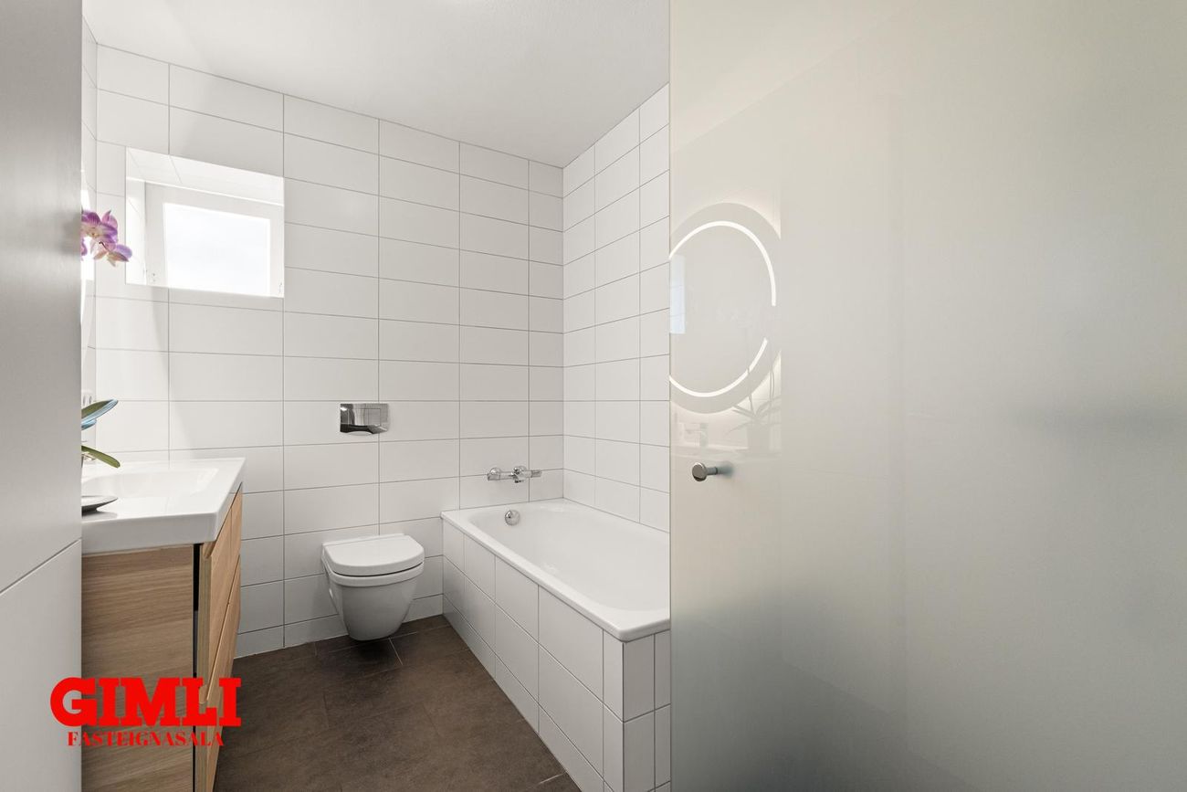Baðherbergi: flísar á gólfi og veggjum. Sturta og baðkar. Innrétting með vaski og gluggi. Hiti í gólfi.