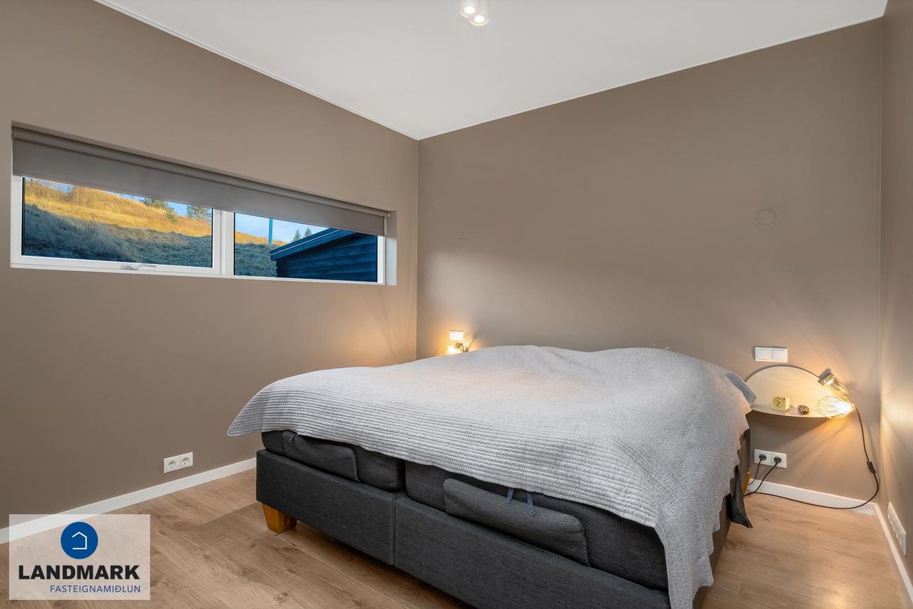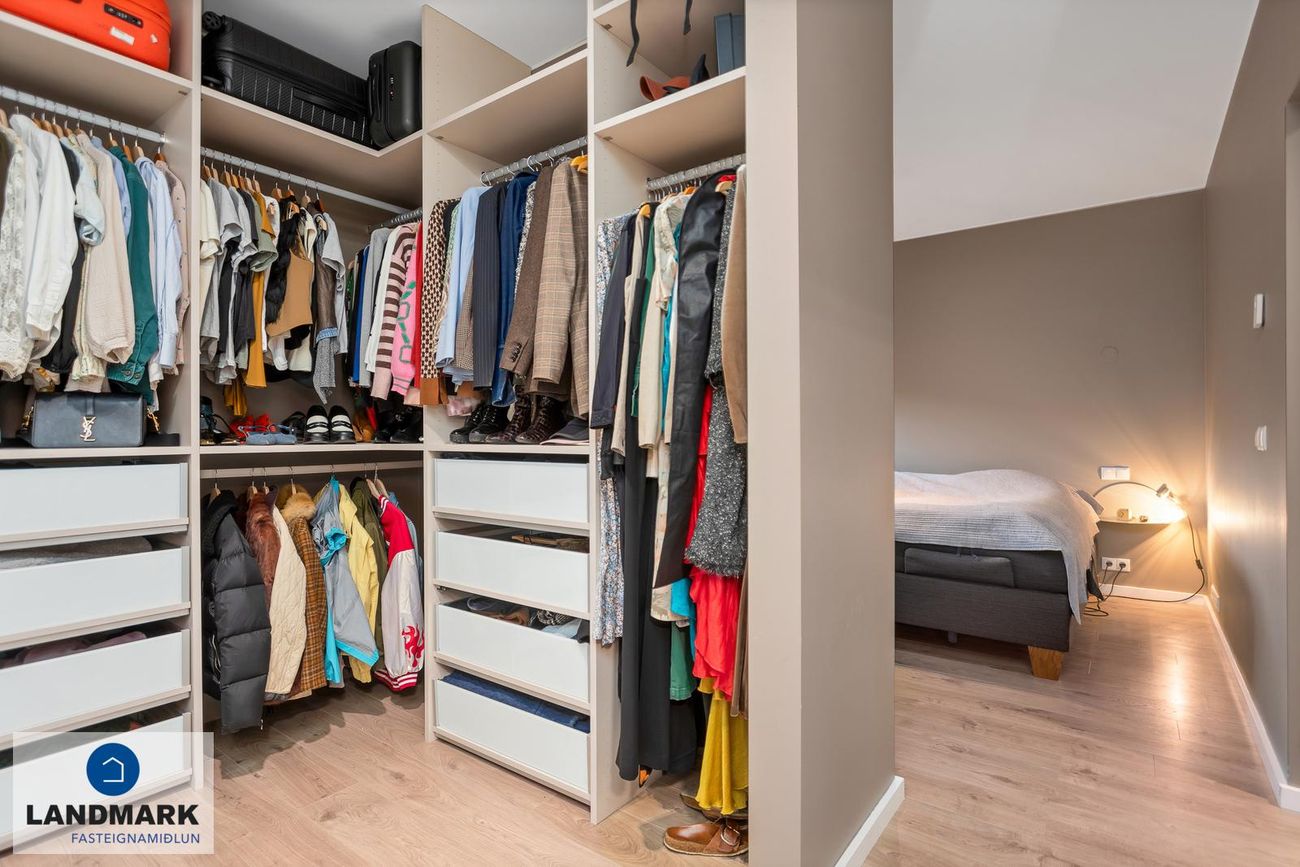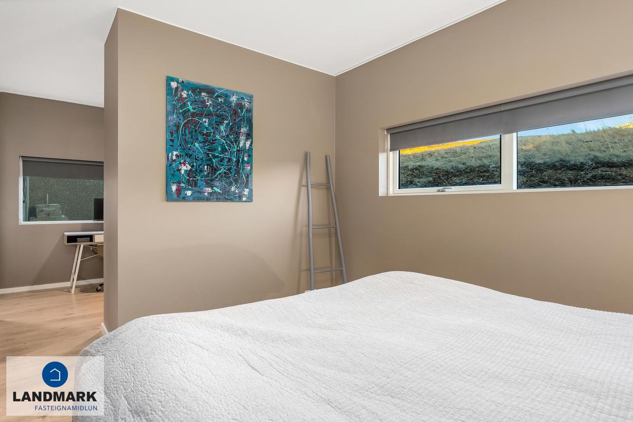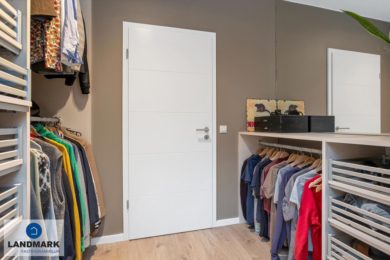 Hjónasvíta: Stór hjónasvíta með tveimur fataherbergjum en einnig er hægt að nýta annað þeirra sem litla skrifstofu.