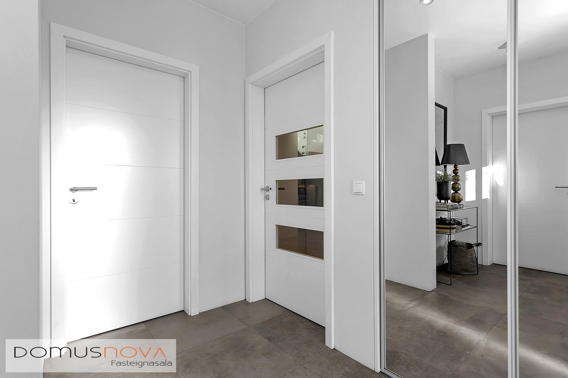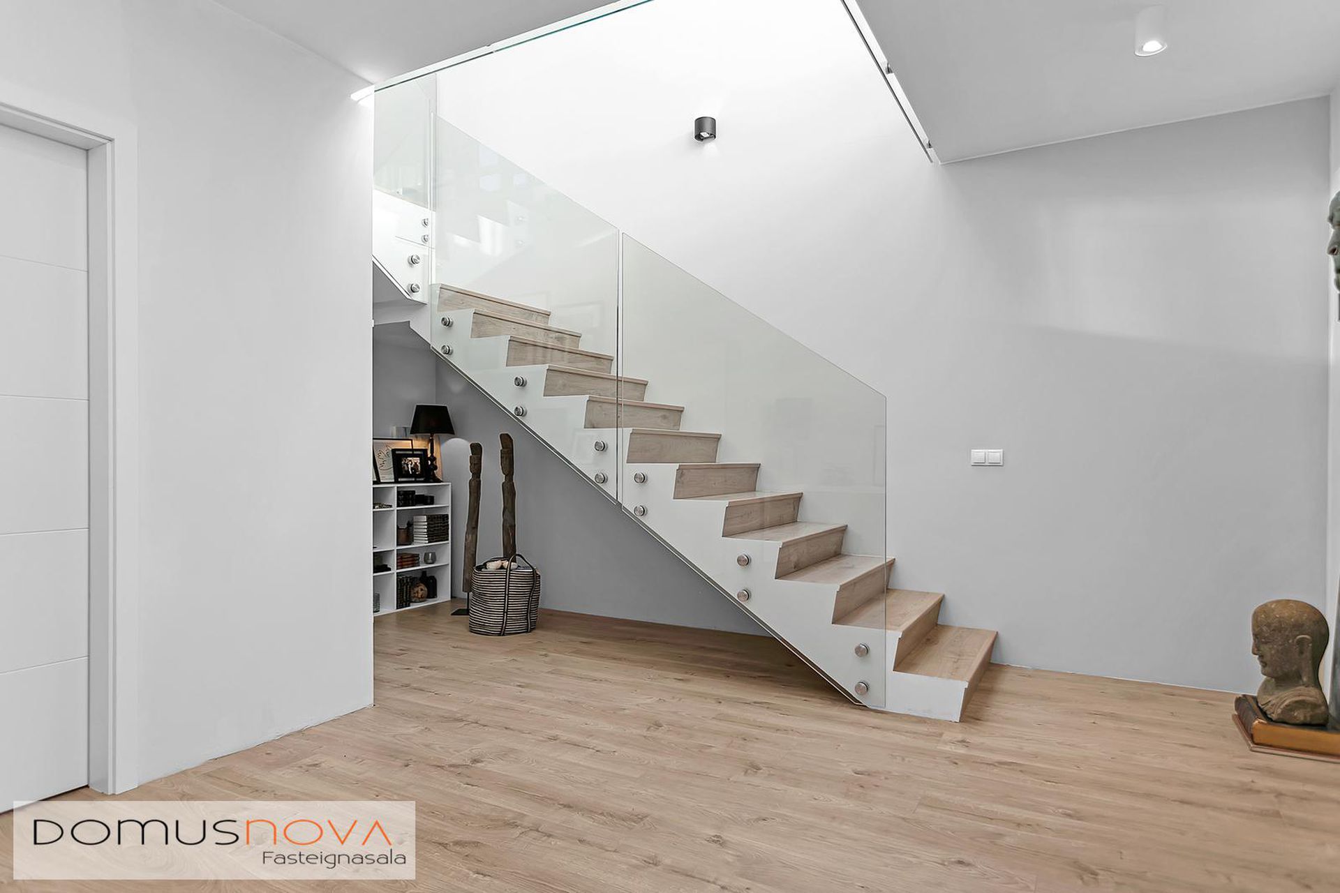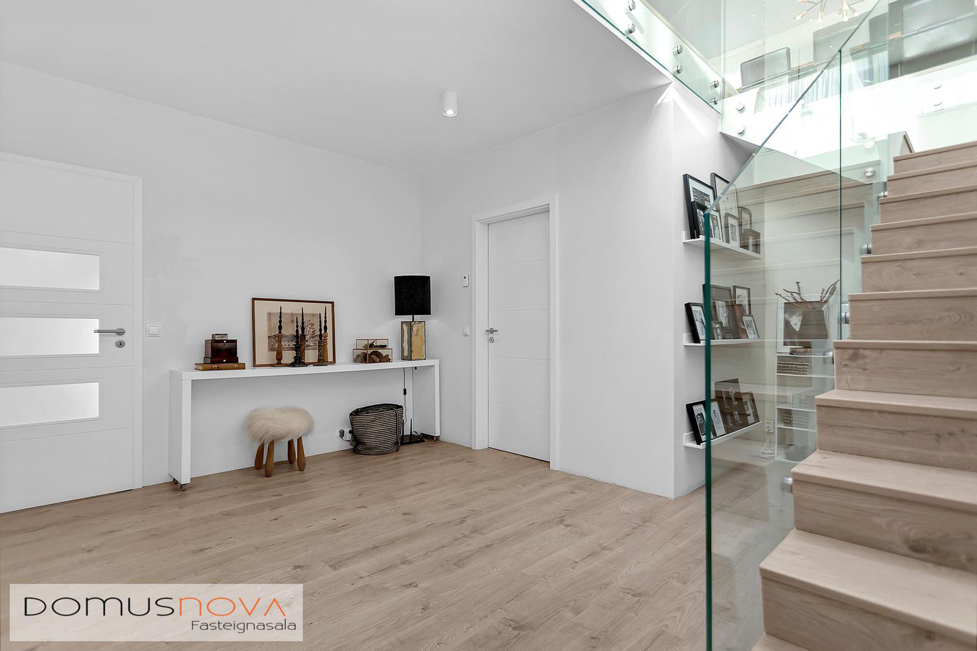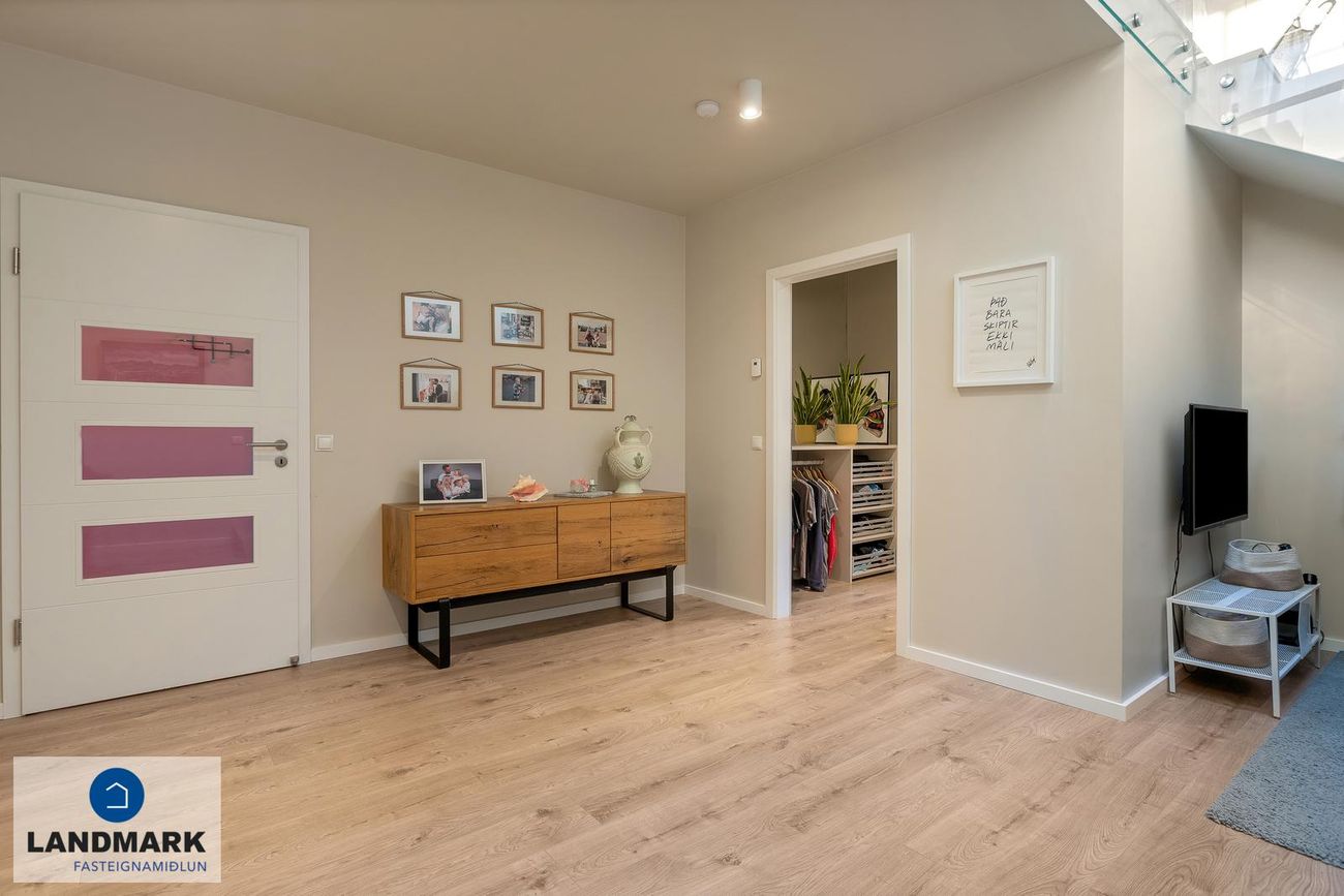 Hol: Úr forstofu er komið inn í rúmgott hol en þaðan er innangengt í hjónasvítu og barnaherbergi. Fallegur stigi með hertu gleri upp á efri hæð en undir stiganum er búið að útbúa lítið leikrými.