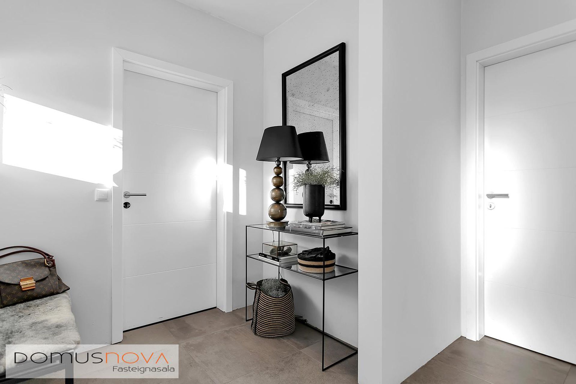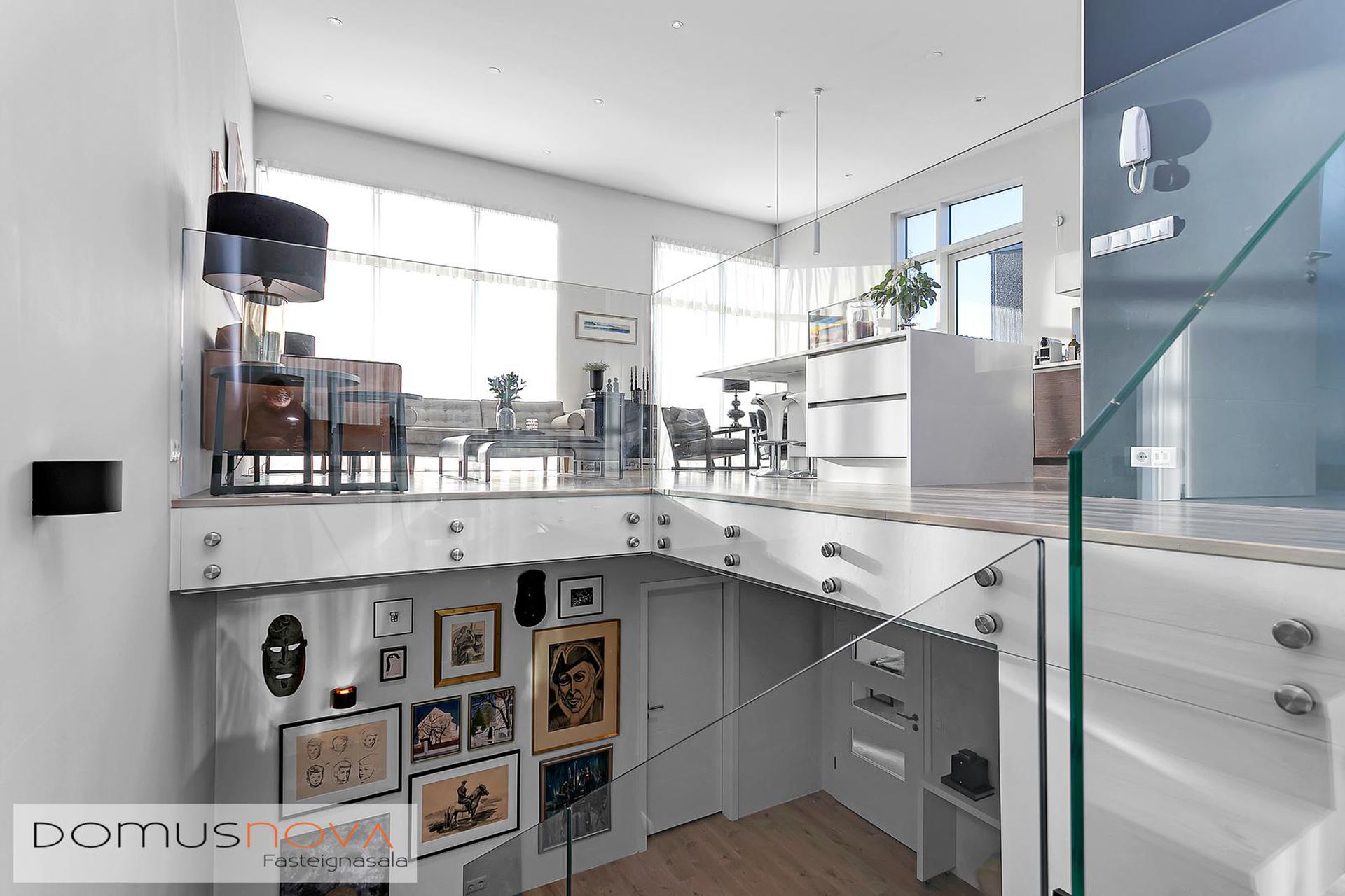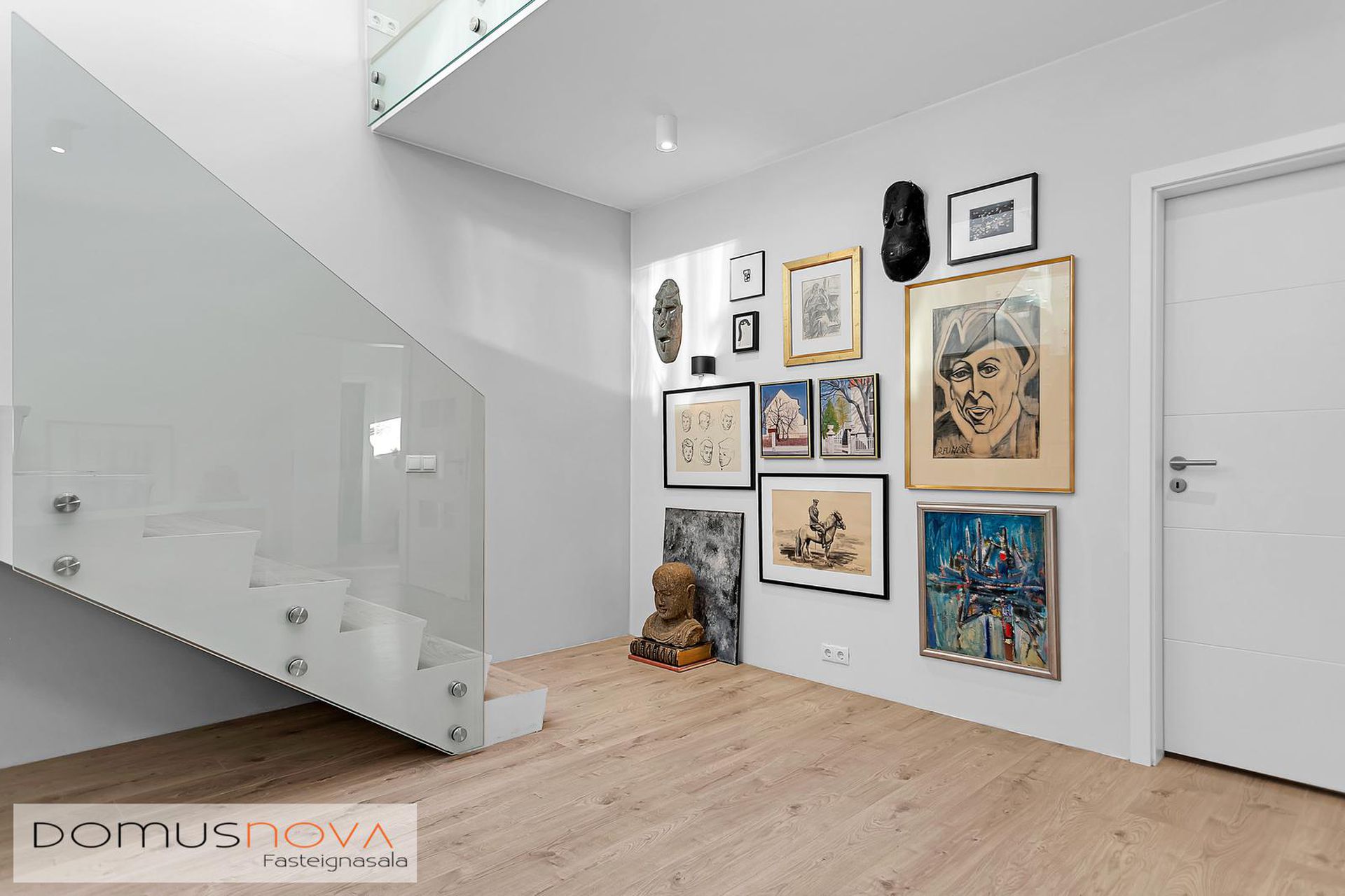 Hol: Úr forstofu er komið inn í rúmgott hol en þaðan er innangengt í hjónasvítu og barnaherbergi. Fallegur stigi með hertu gleri upp á efri hæð en undir stiganum er búið að útbúa lítið leikrými.
