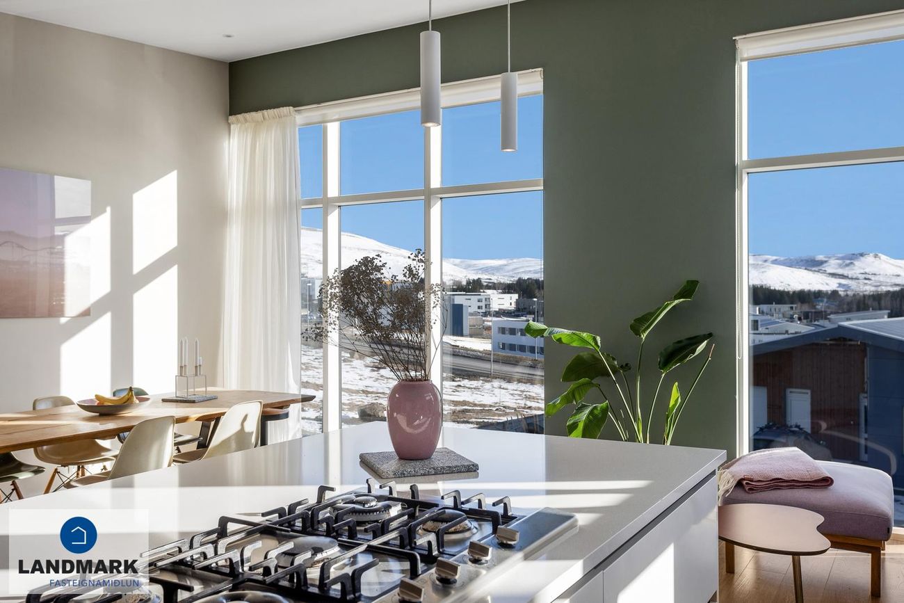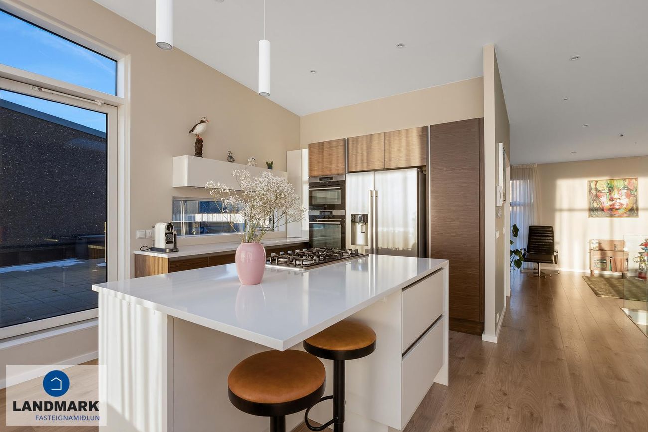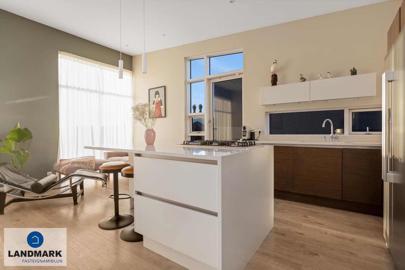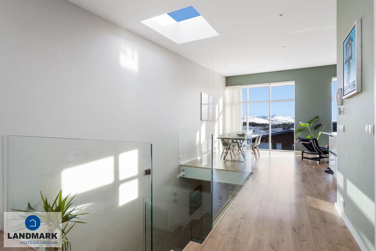 Nánari lýsing:Efri hæðStofa / borðstofa: Björt og opin stofa þar sem aukin lofthæð nýtur sín, gólfsíðir gluggar og fallegt útsýni.