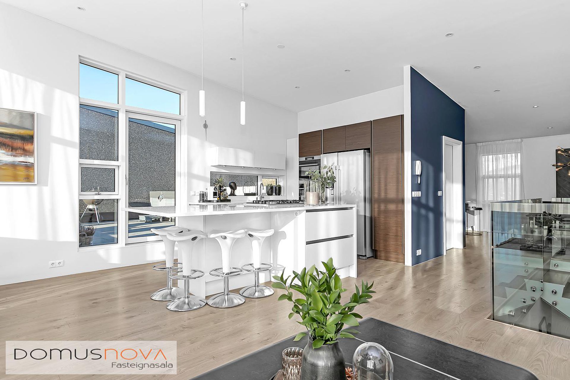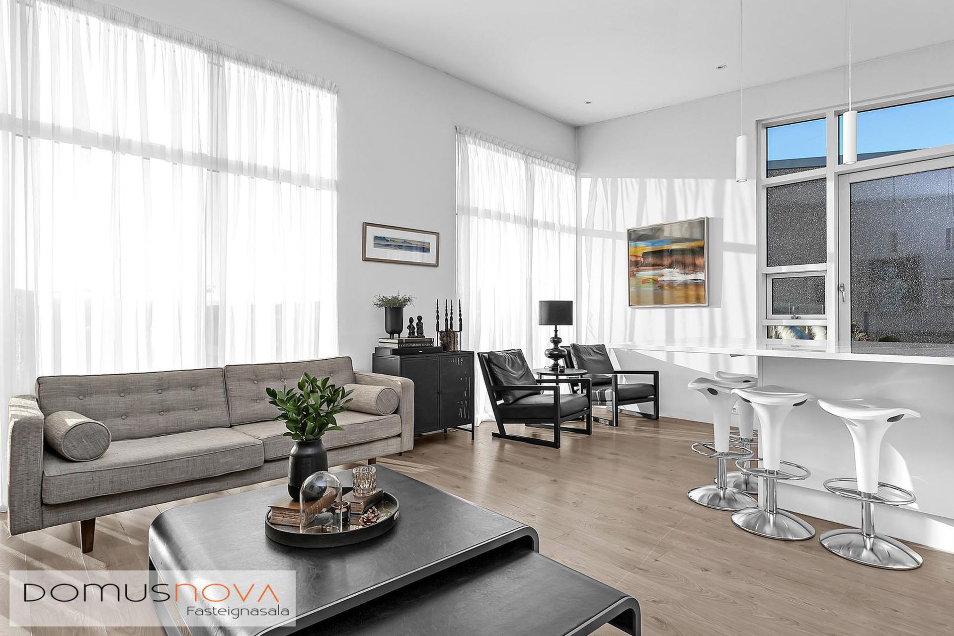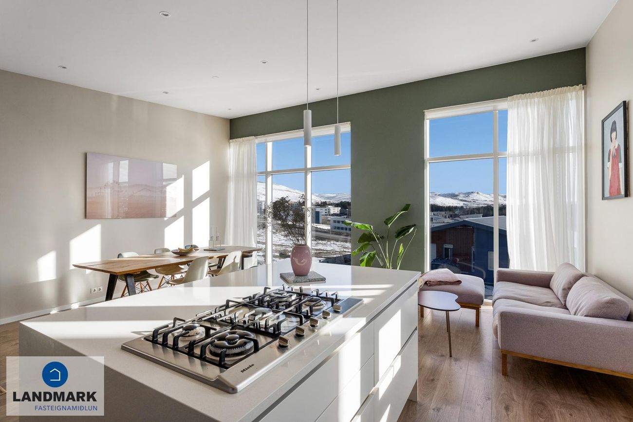 Nánari lýsing:Efri hæðStofa / borðstofa: Björt og opin stofa þar sem aukin lofthæð nýtur sín, gólfsíðir gluggar og fallegt útsýni.
