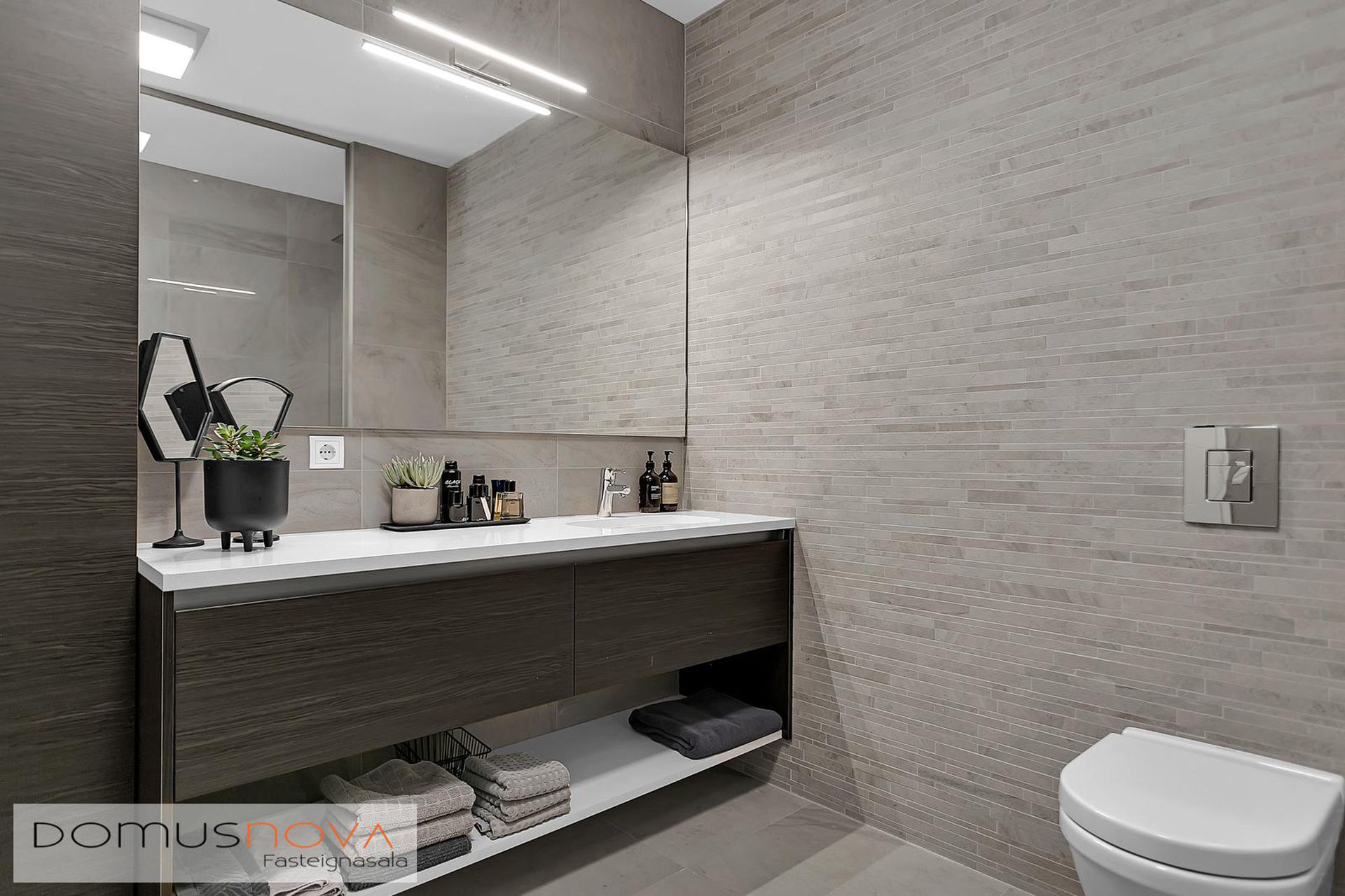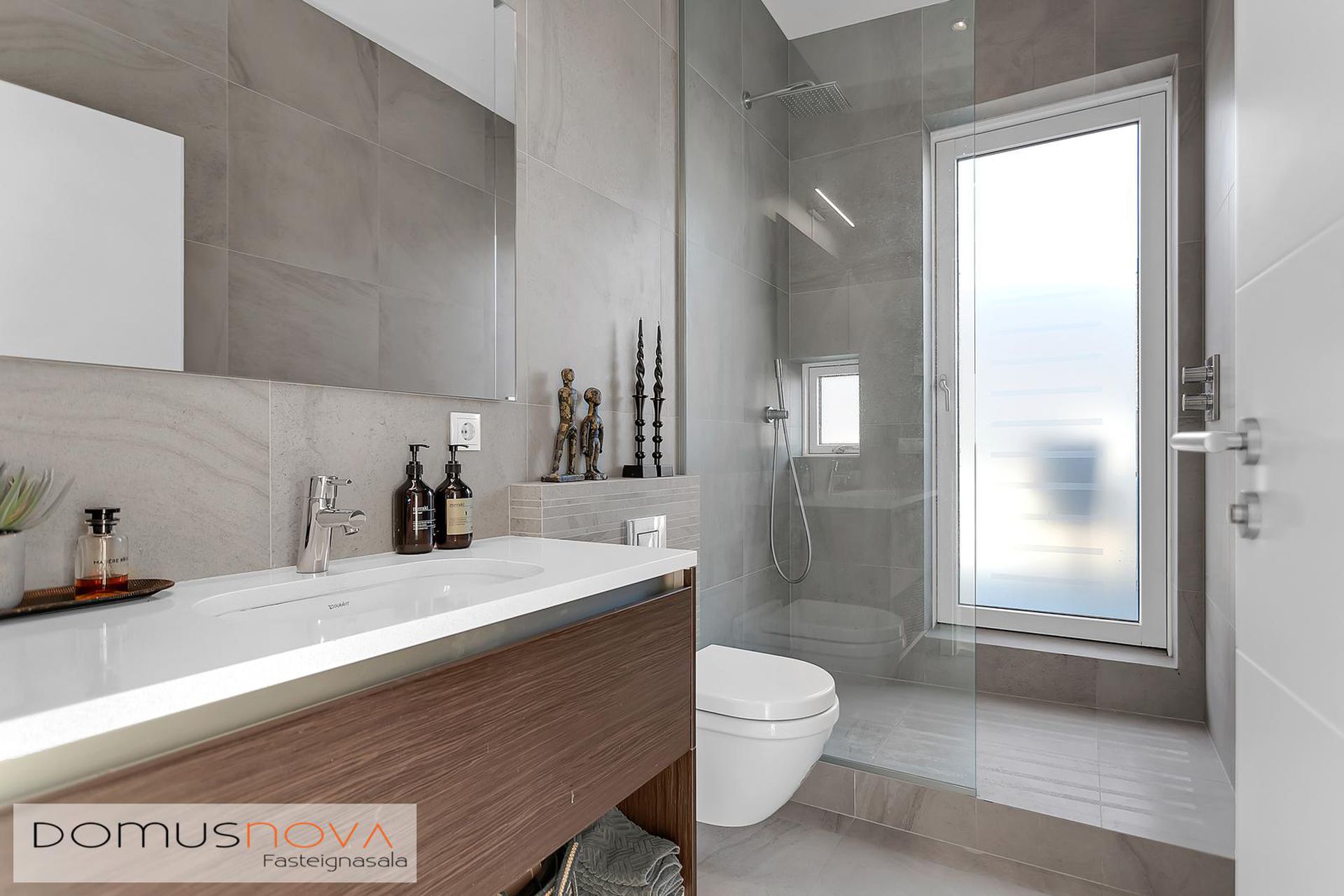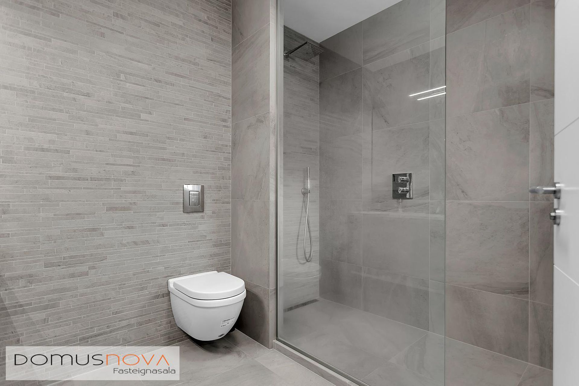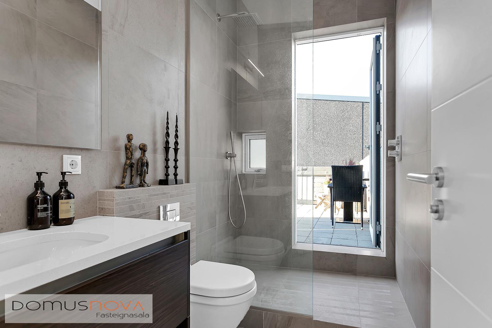 Baðherbergi: Flísar á gólfi og veggjum, upphengd innrétting og salerni ásamt "walk-in" sturtu þaðan sem er hægt að fara beint út á svalir.