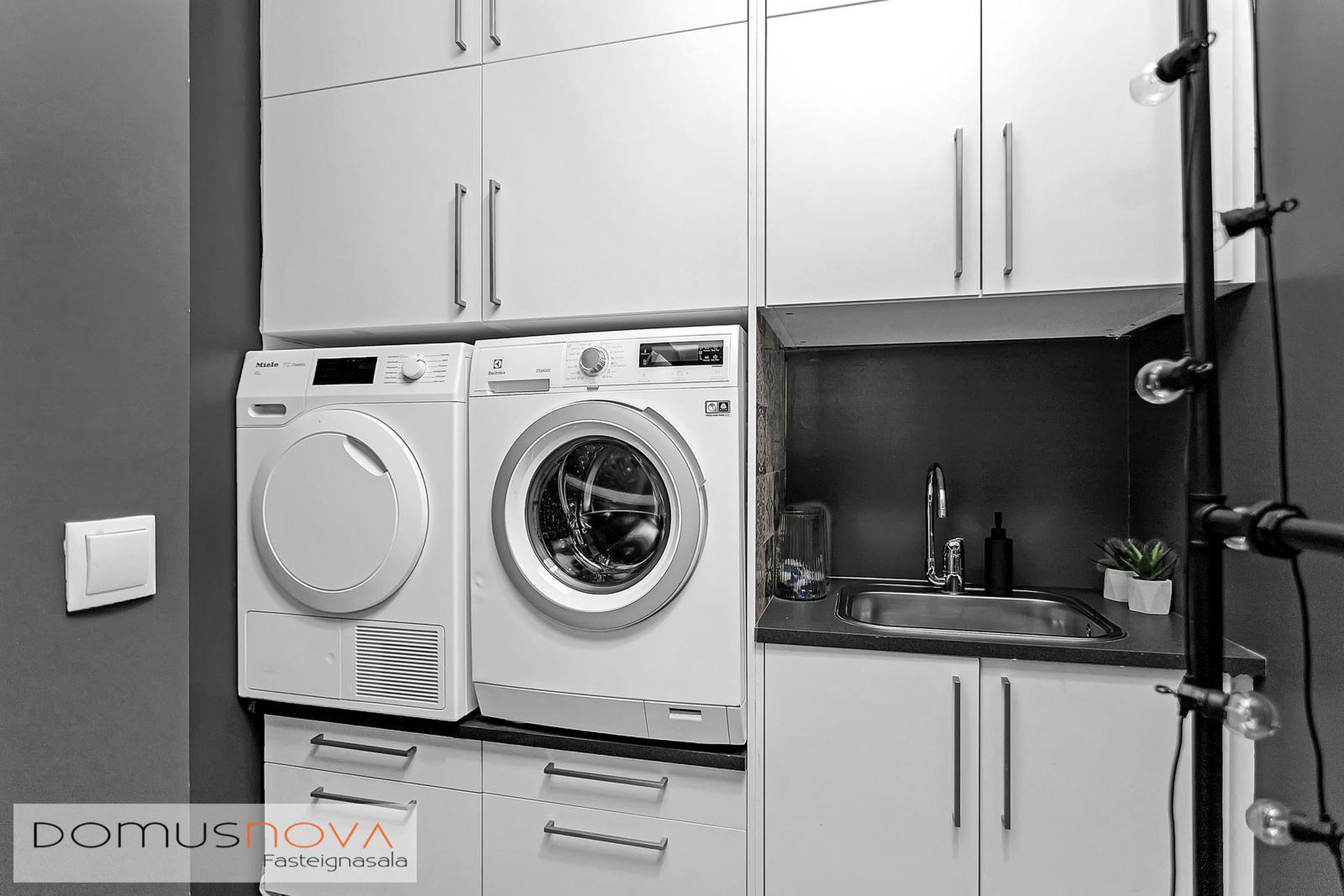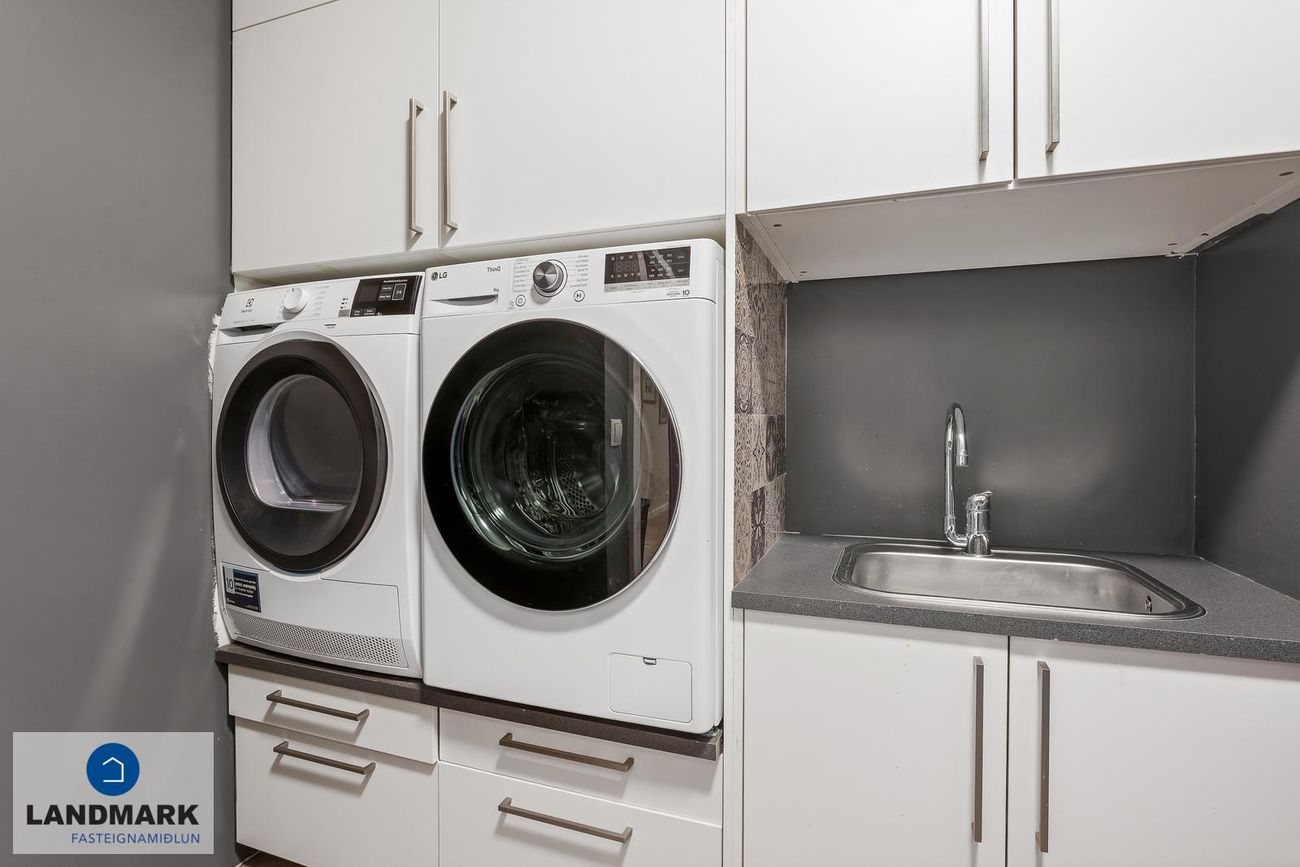 Þvottahús: Innrétting með góðu skápaplássi þar sem gert er ráð fyrir þvottavél og þurrkara í vinnuhæð. Ræstivaskur í innréttingu.