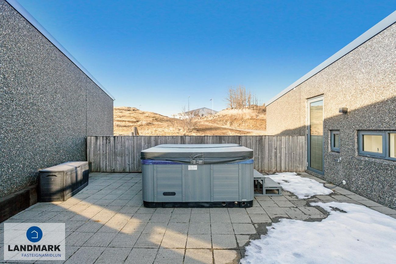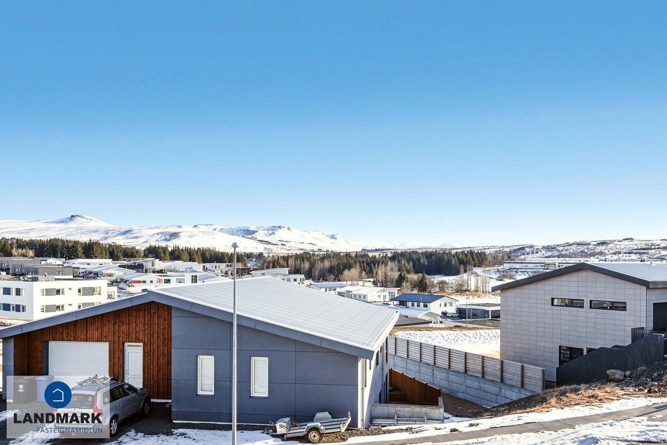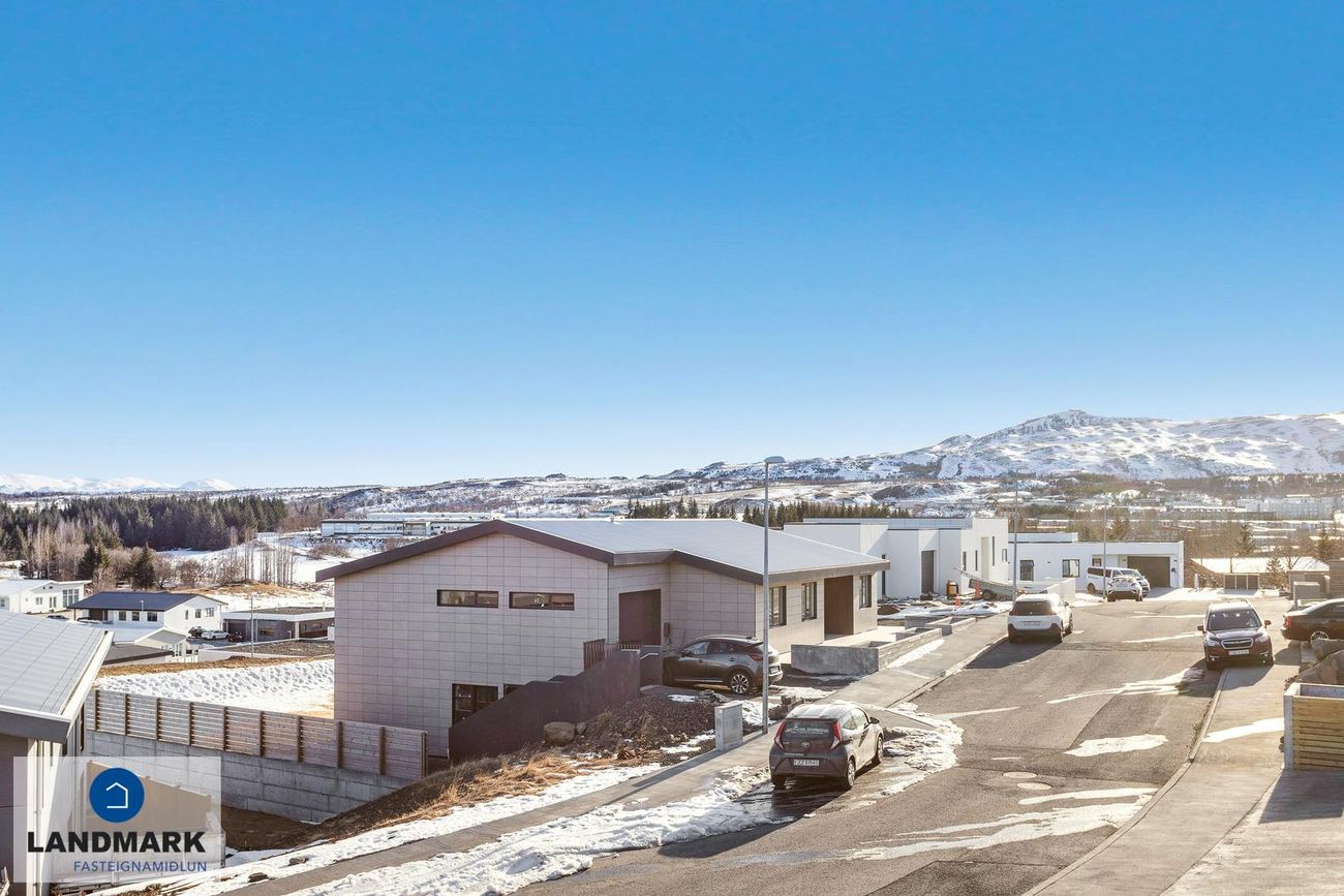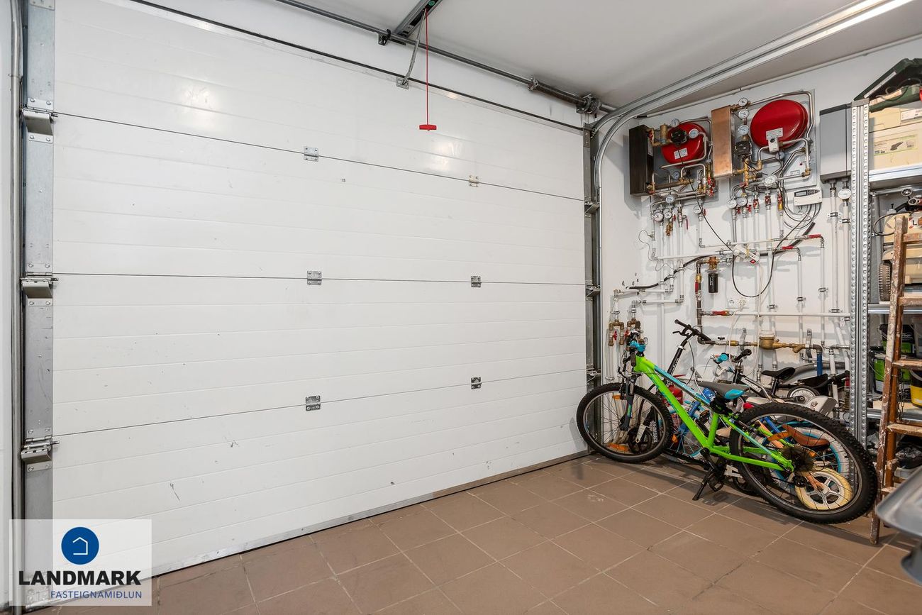 Lóð: Snjóbræðsla í bílaplani framan við húsið. Búið er að setja upp hleðslustöð við bílskúrshurð.