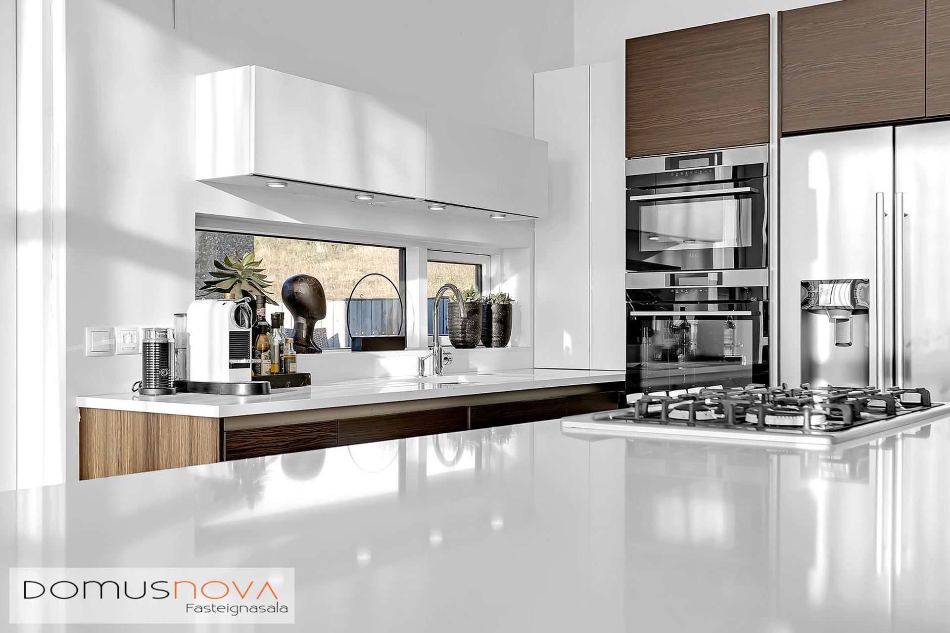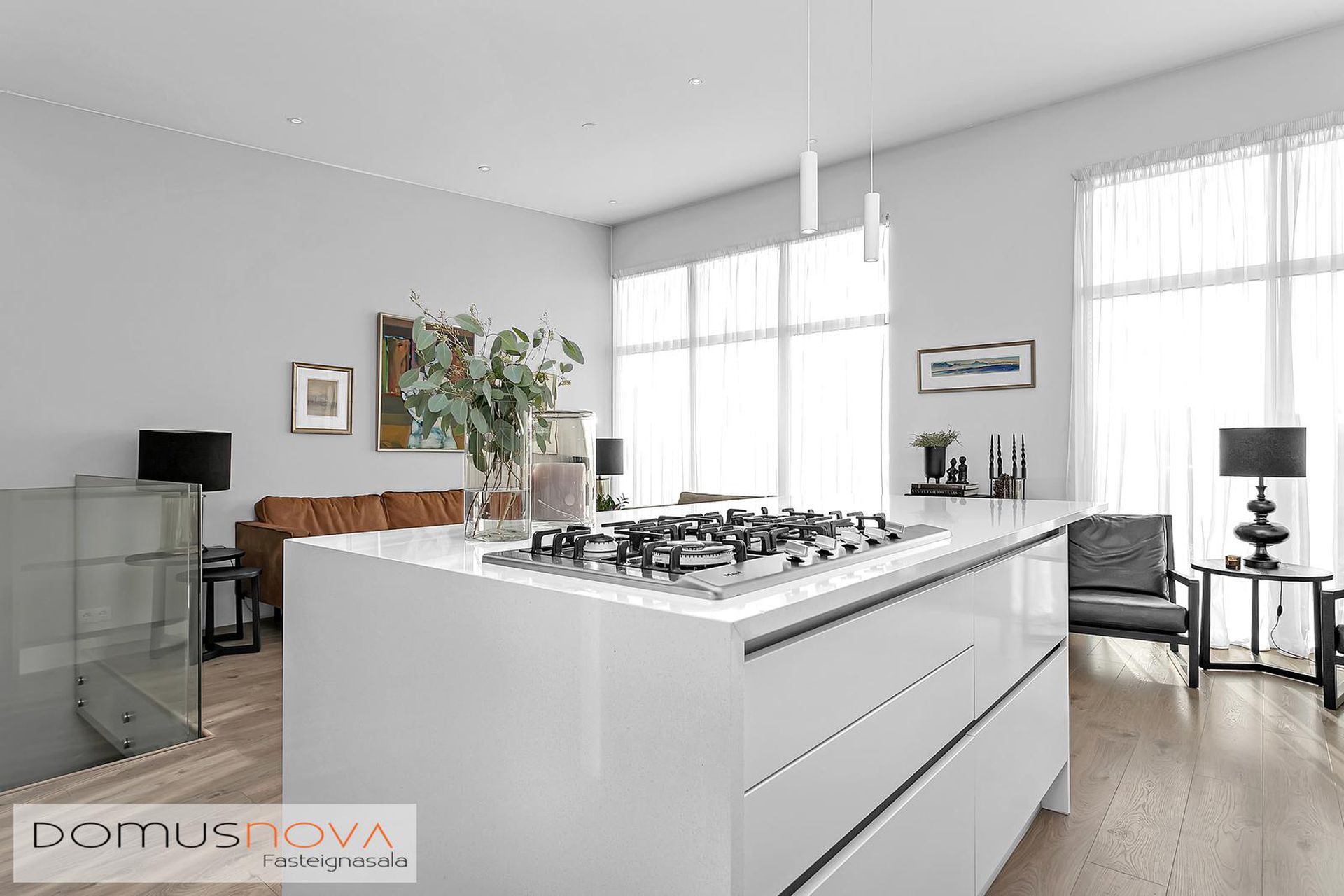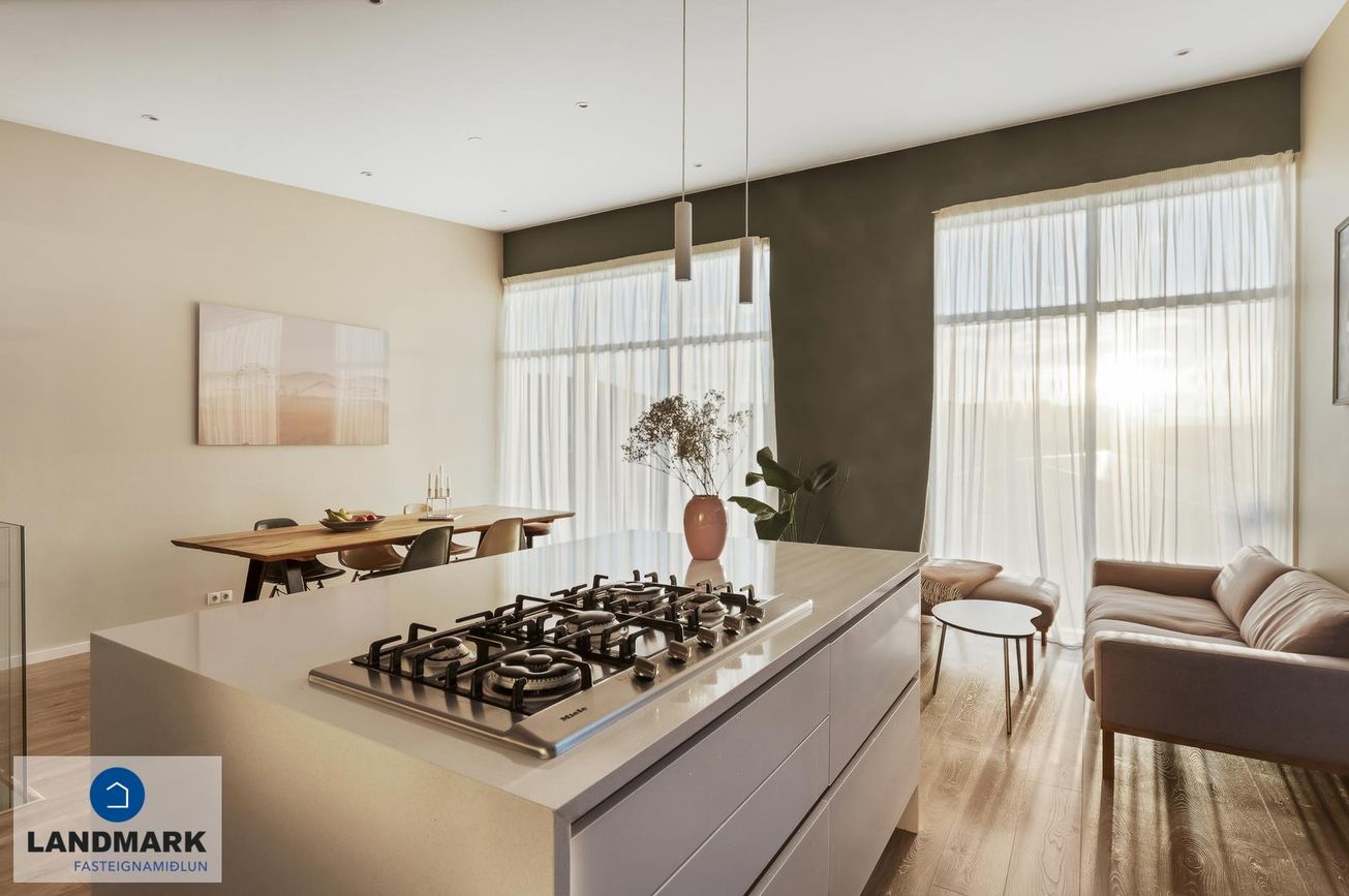 Eldhús: Rúmgott og opið eldhús með eyju. HTH innrétting með góðu skápaplássi, get er ráð fyrir tvöföldum ísskáp í innréttingu, innbyggð uppþvottavél, gashelluborð, blástursofn og combi ofn. Borðplata úr kvartssteini er á innréttingunni.