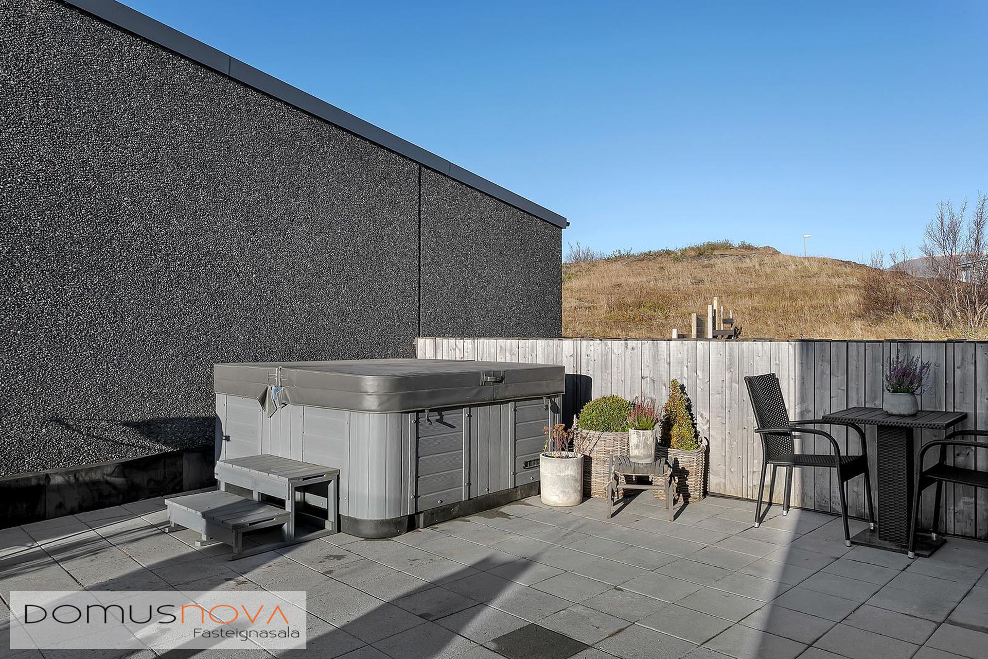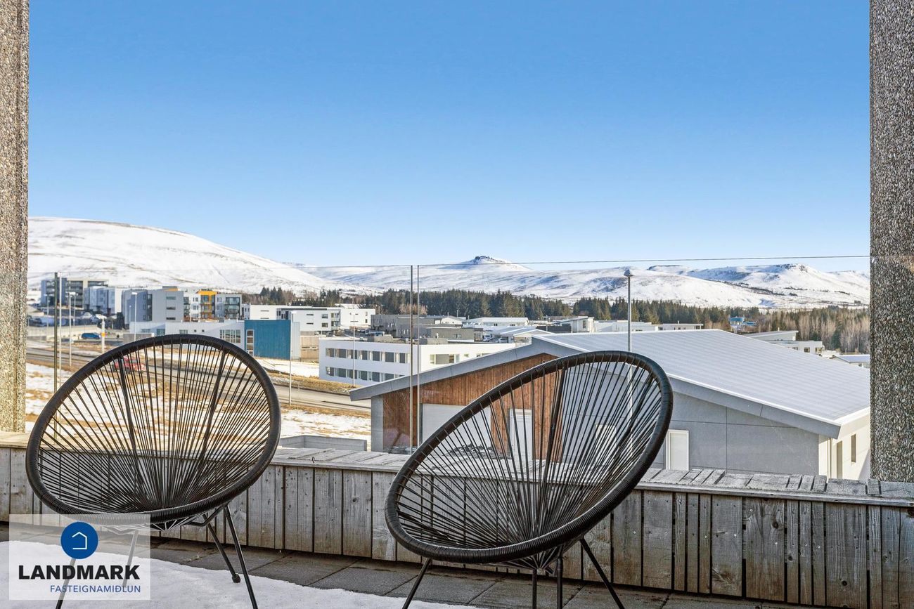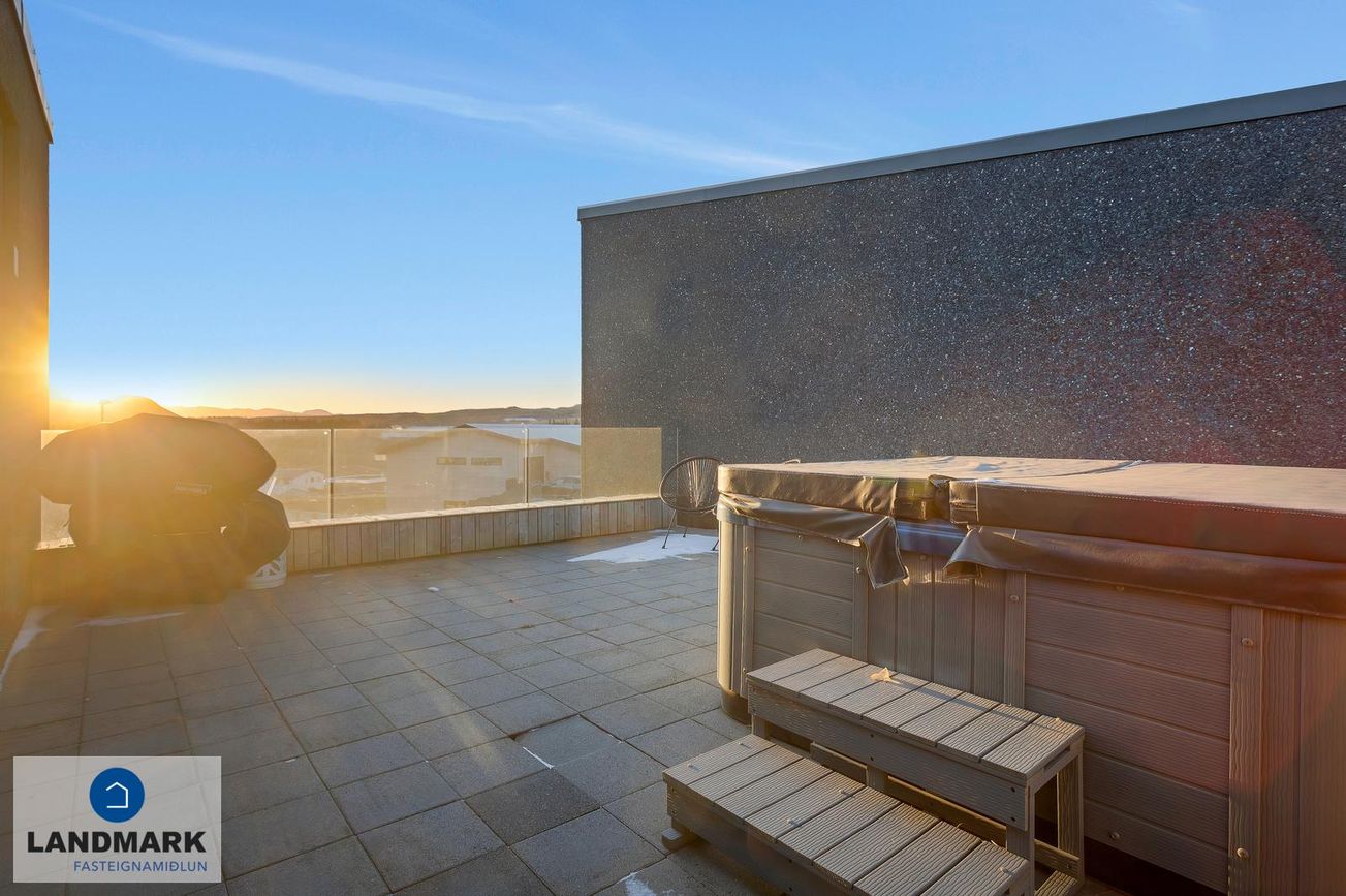 Svalir: Stórar hellulagðar svalir með heitum potti og fallegu útsýni en útgengt er á svalirnar bæði úr eldhúsi og baðherbergi.