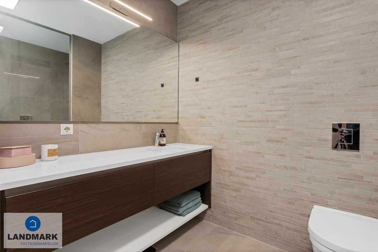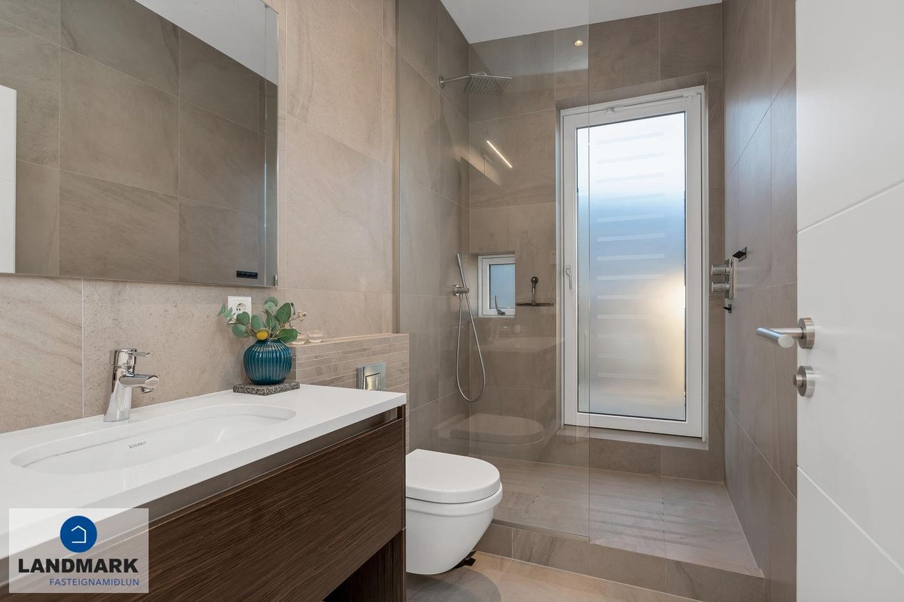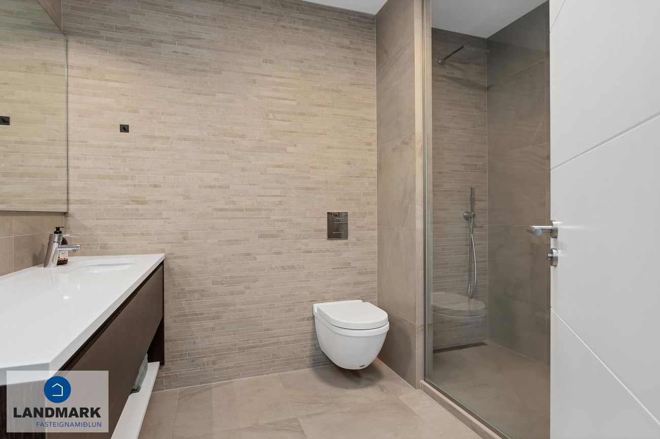 Baðherbergi: Inn af hjónasvítunni er baðherbergi með flísum á gólfi og veggjum, "walk-in" sturta, upphengd innrétting og salerni.