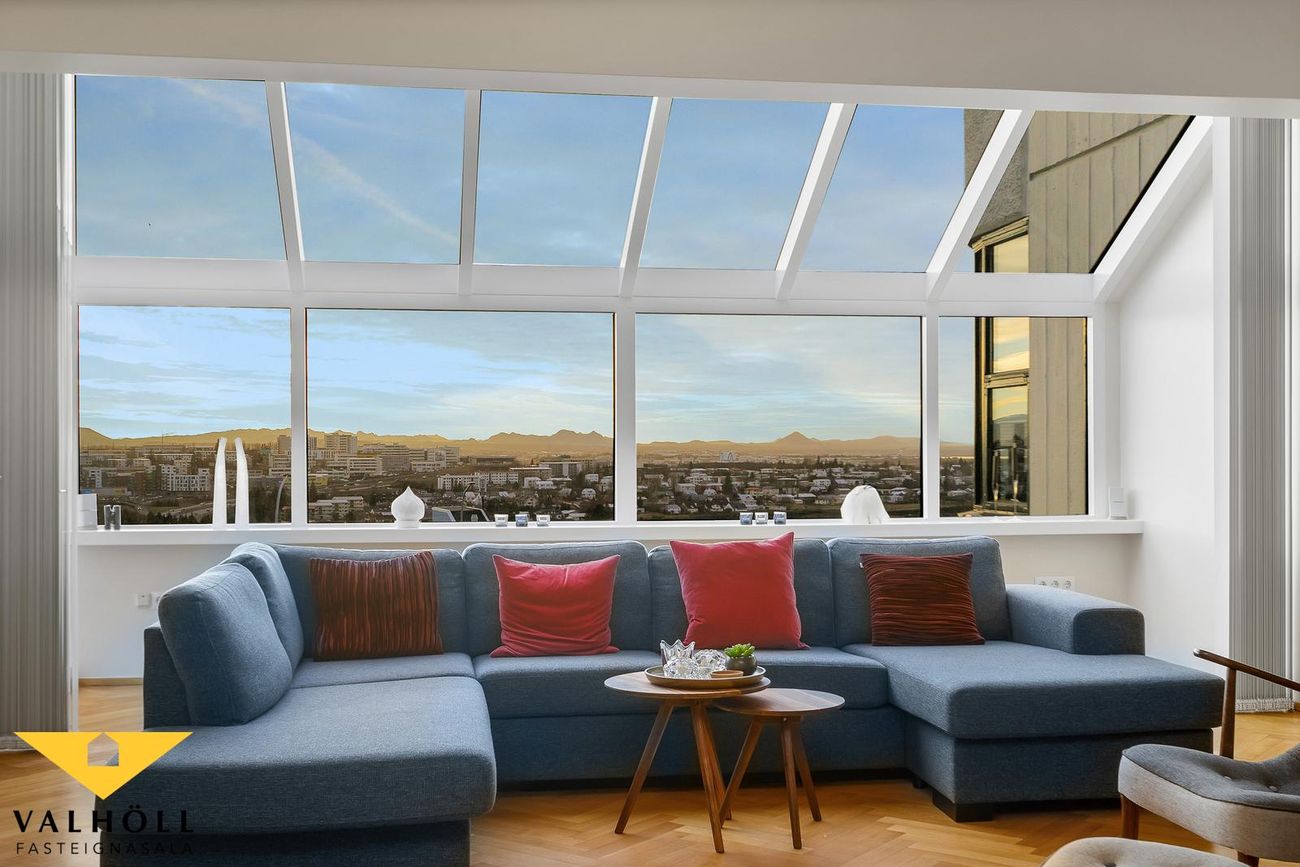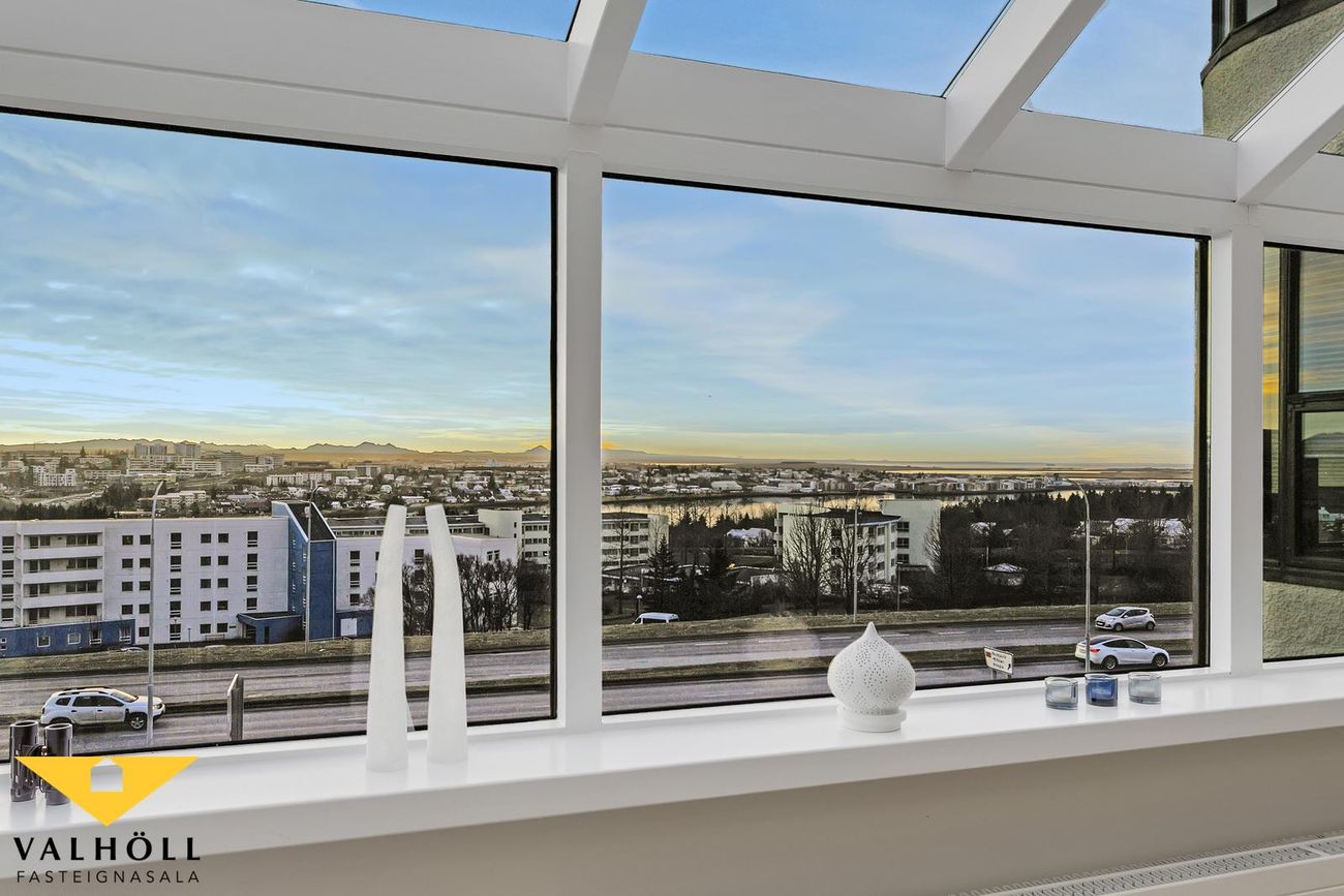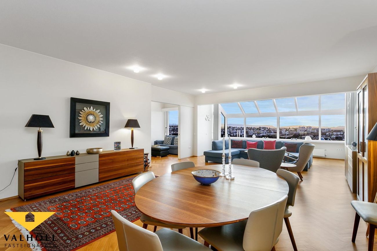 Smelltu hér til að sjá myndband af eigninni.Húsið, Efstaleiti 10-14, heitir Breiðablik og var það teiknað af arkitektunum Garðari Halldórssyni og Ingimuni Sveinssyni. Það var byggt árið 1985 og þótti lengi eitt glæsilegasta fjölbýlishús landsins og þykir jafnvel enn. Glæsilegt útsýni er frá húsinu og einstaklega vegleg sameign. Frábær staðsetning miðsvæðis í Reykjavík. Örstutt í verslanir og alla helstu þjónustu. Útivistarsvæði og fallegar gönguleiðir eru í næsta nágrenni.Íbúðin er skráð 154,3 fm að stærð og skiptist hún í 144,8 fm íbúð og 9,5 fm geymslu. Til viðbótar eru svo 8 fm svalir ásamt stæði í bílageymslu.