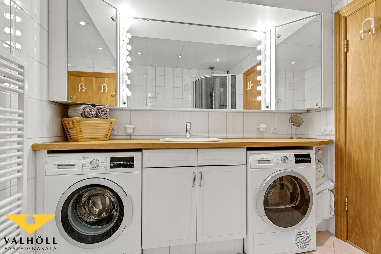 Baðherbergi: með innréttingu, sturtuklefa, handklæðaofni, aðstöðu fyrir þvottavél og þurrkara og flísum á gólfi.