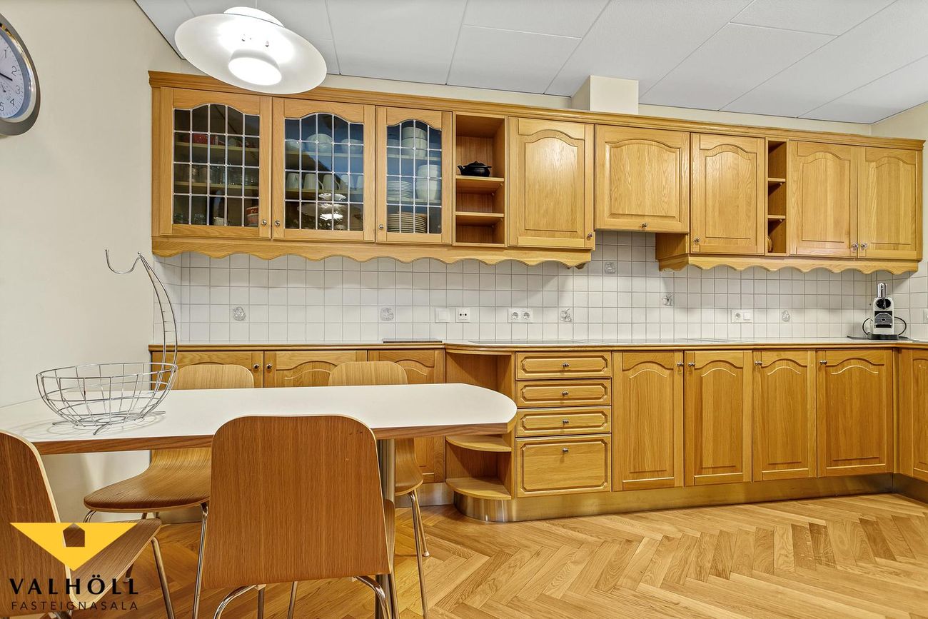 Léttur veggur skilur að stofu og eldhús og væri hægt að opna þar á milli. Gegnheilt eikarparket með fiskibeinamunstri er á gólfum nema það eru flísar á baðherbergi.
