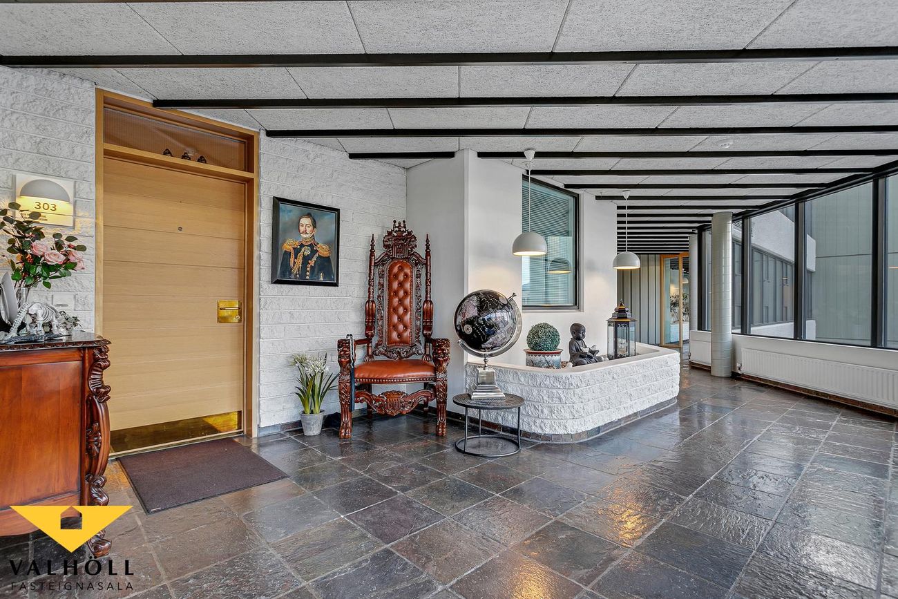 Valhöll kynnir rúmgóða þriggja til fjögurra herbergja íbúð á 3. hæð (engin íbúð fyrir ofan) í lyftuhúsi í Efstaleiti 10 í Reykjavík. Stæði í upphitaði bílageymslu fylgir með. Glæsilegt útsýni er úr íbúðinni til austur, suður og vestur, til fjalla og sjávar. Sameignin er einstaklega vegleg og telur m.a. sundlaug, heitan pott, saunu, líkamsræktarsal, veislusal, setustofur, billiardaðstöðu og fleira. Húsvörður er búsettur í húsinu, í íbúð sem er í eigu húsfélagsins, og sér hann um daglegan rekstur hússins og viðhald.