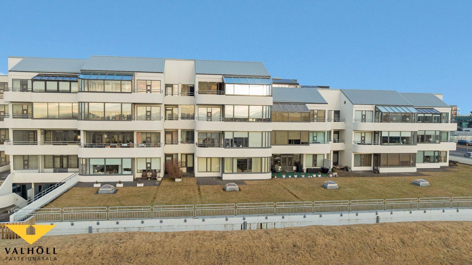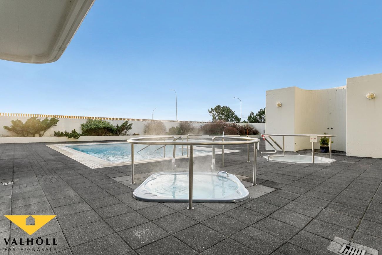 Lóðin: Lóðin er fullfrágengin með fjölda bílastæða á malbikuðu plani, hellulögðum stéttum og fallegum gróðri. Baklóðin er öll afgirt og þar er m.a. að finna upphitaða stóra sundlaug og heita potta.