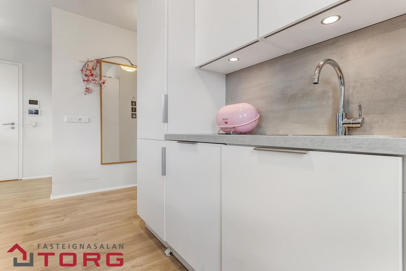 Fasteignasalan TORG kynnir: LÆKKAÐ VERÐ: Falleg og vel skipulögð 3ja herbergja enda-íbúð með suðursvölum ásamt stæði í bílageymslu með rafhleðslu. Íbúðin er á fyrstu hæð í nýlegu lyftufjölbýli og er skráð 90,7 fm og skiptist í anddyri, alrými með eldhúsi með eyju og stofu með útgengi út á svalir, tvö svefnherbergi, baðherbergi, þvottaherbergi og sér geymslu í sameign sem er 9,6fm. Sameiginleg hjólageymsla á hæðinni með sér inngangi og sérstöku aukaöryggi auk þess sem önnur hjólageymsla er fyrir utan húsið. Allar nánari upplýsingar veitir Jóhanna Kristín Tómasdóttir, löggiltur fasteignasali, í síma 8378889 eða hjá johanna@fstorg.isNánari lýsing: Efstaleiti 11 í nýja Efstaleitisreitnum frá 2020, byggður í gamalgrónu hverfi þaðan sem stutt er í alla þjónustu, svo sem Kringluna, heilsugæslu og skóla. Í reitnum sjálfum eru einnig apótek, veitingahús og hárgreiðslustofa svo eitthvað sé nefnt. Reiturinn er sérlega vel skipulagður með misháum og mislitum húsum og fallegur, skjólsæll garður með leiktækjum og reiðhjólaskýlum. Við hönnun íbúðahverfisins var unnið markvisst með stöllun húsa í hæð, formi og mótun lands svo úr verður ásýnd stakstæðra húsa með skemmtilegum þakgörðum og svölum.