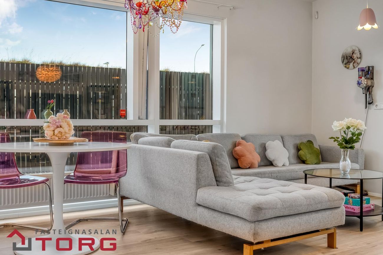 Forstofa/stofa/eldhús: Komið er inn í opið, bjart rými. Þrefaldur fataskápur við innganginn og í eldhúsinu er innrétting með áfastri eyju og gólfsíðum glugga. Stofan er afar rúmgóð með gólfsíðum gluggum og útgengi út á suðursvalir.