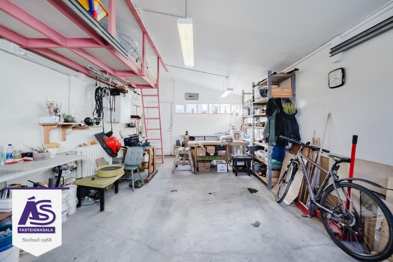 Bílskúr er rúmgóður með litlu geymslulofti, hurð er út í garð, vaskur, 3ja fasa rafmagn.