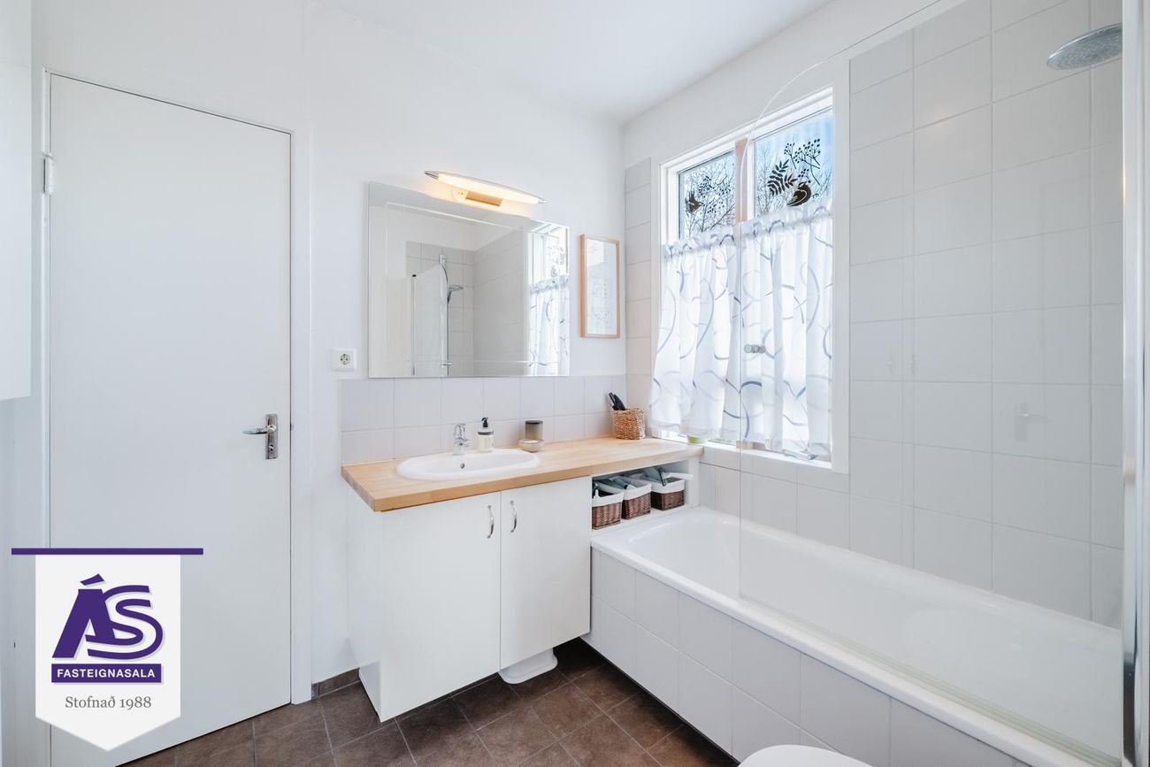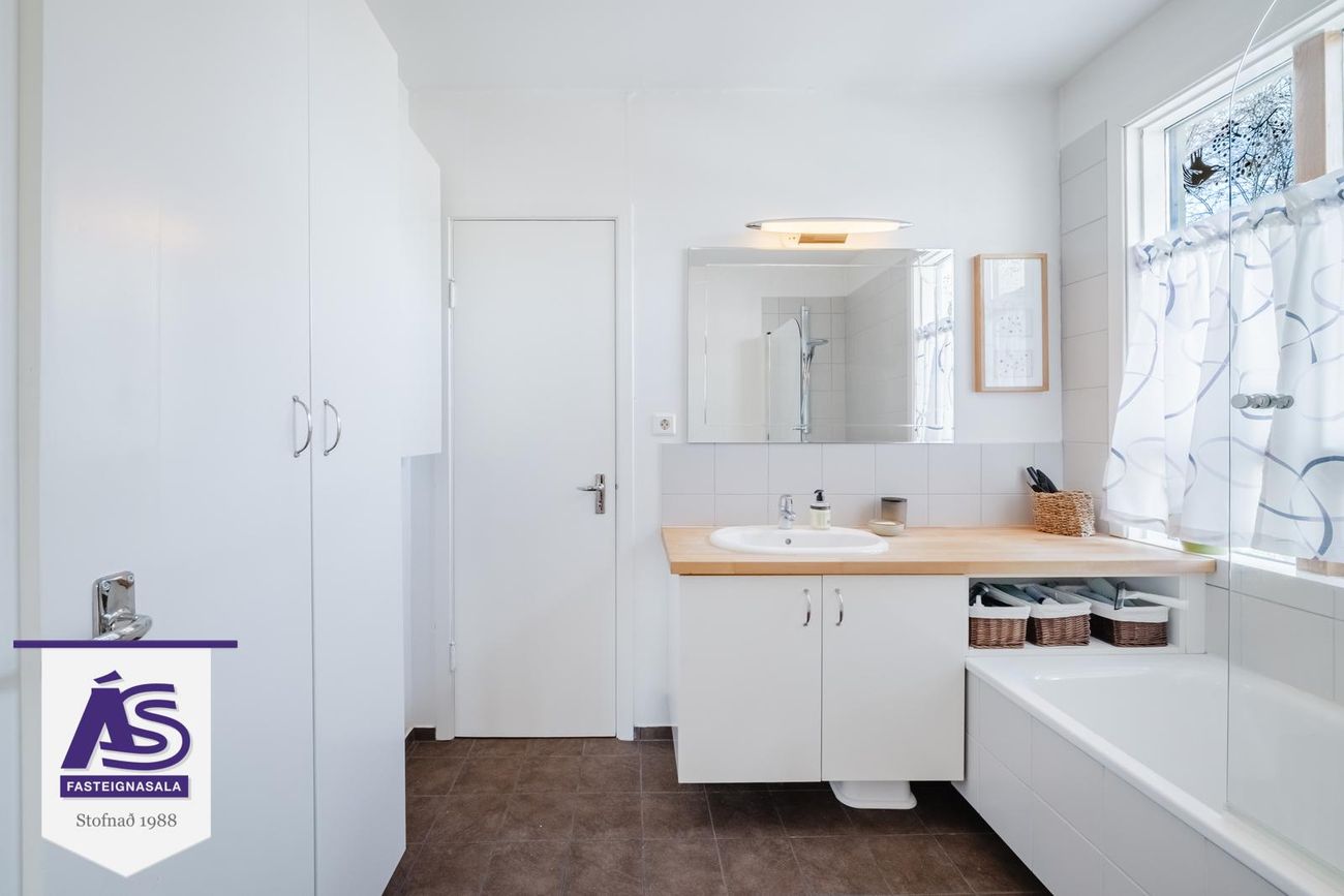 Baðherbergi er innagengt af forstofugangi og einnig úr hjónaherbergi.