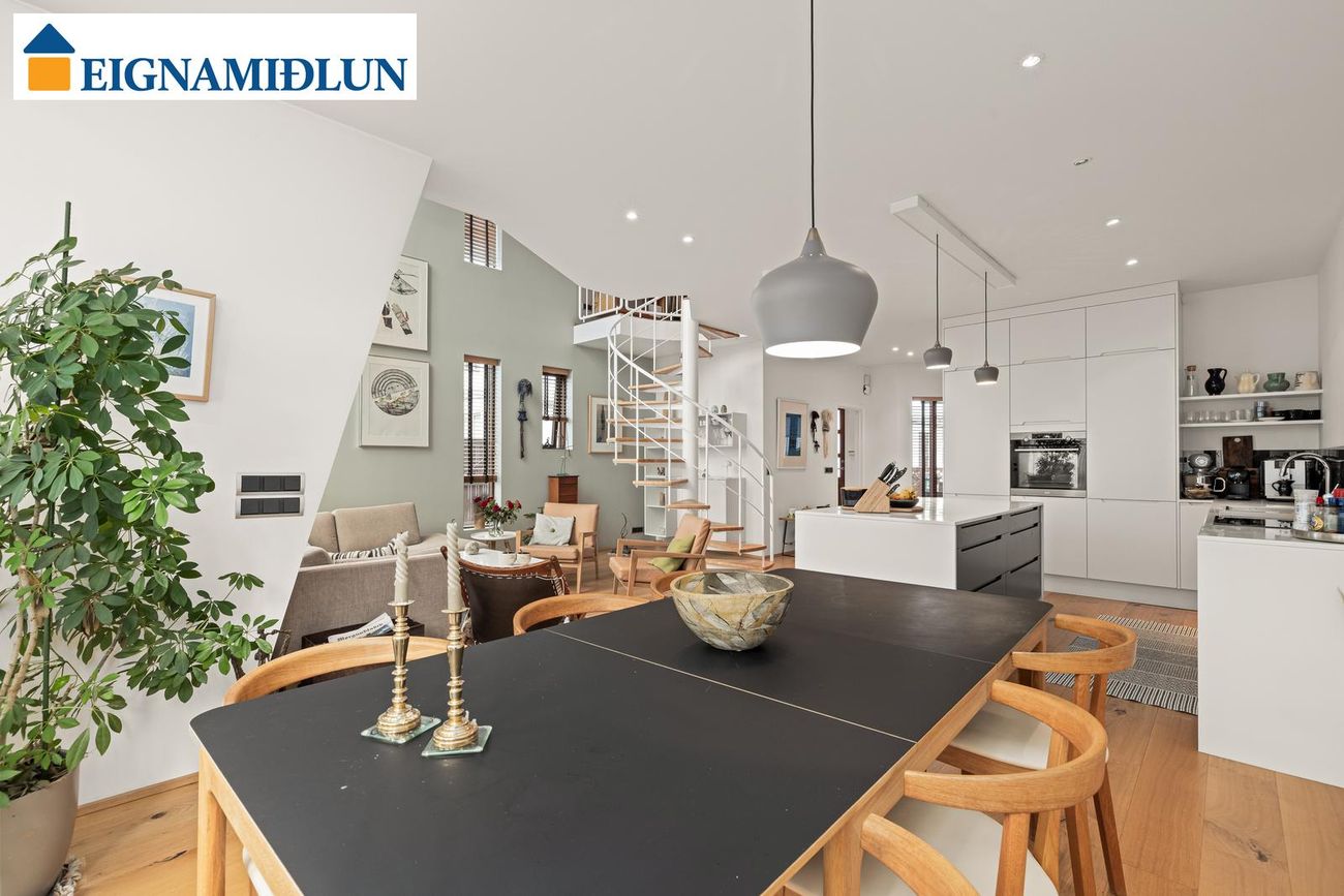 hringstigi. Á efri hæðinni er einnig mikil lofthæðin þar hún er mest um 3,8 m. Komið er upp í parketlagða