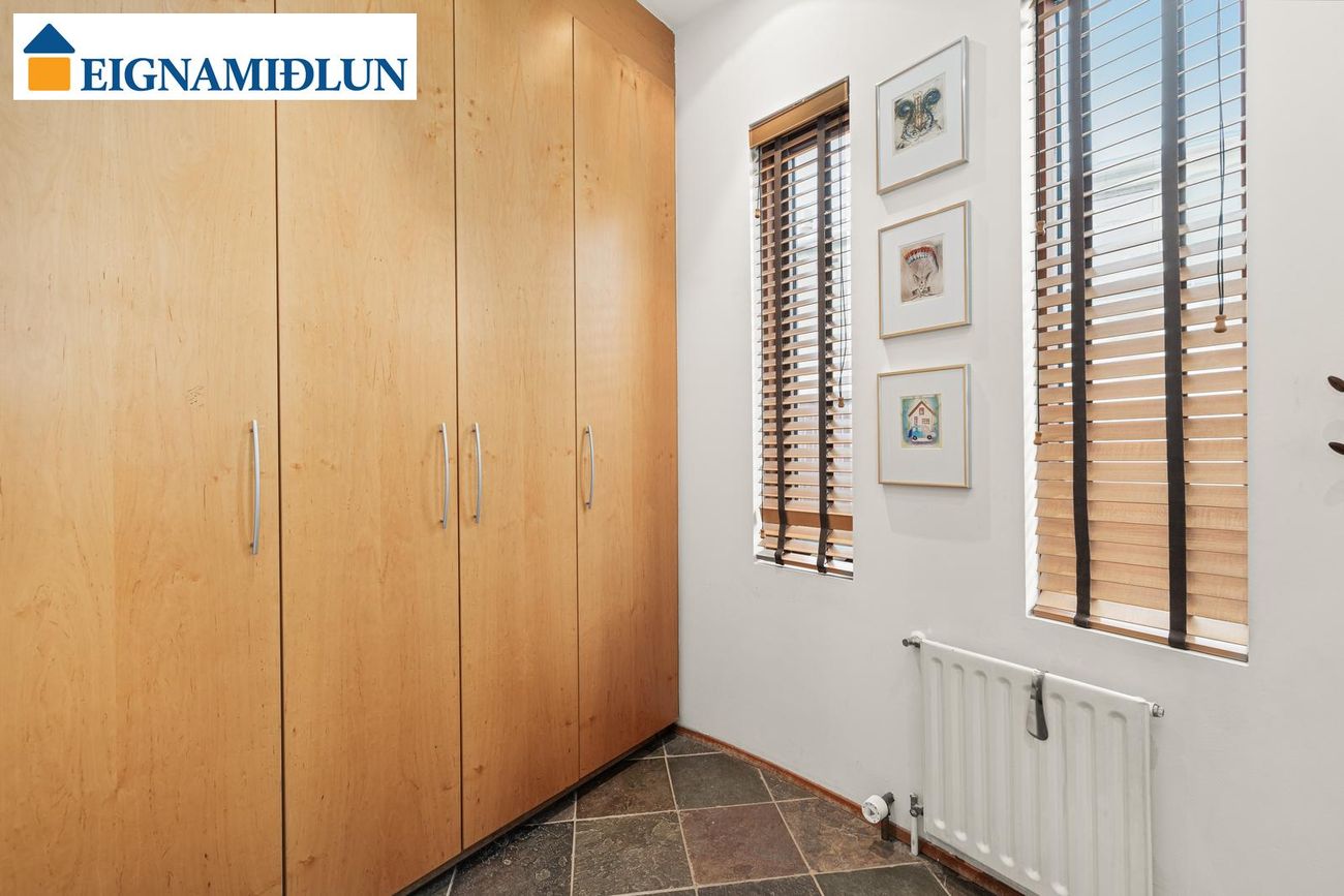 anddyri með vönduðum skápum sem ná upp í loft. Aukainngangur er í flísalagt