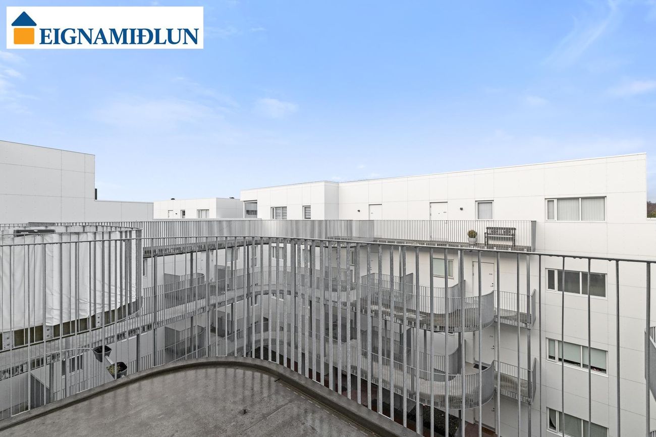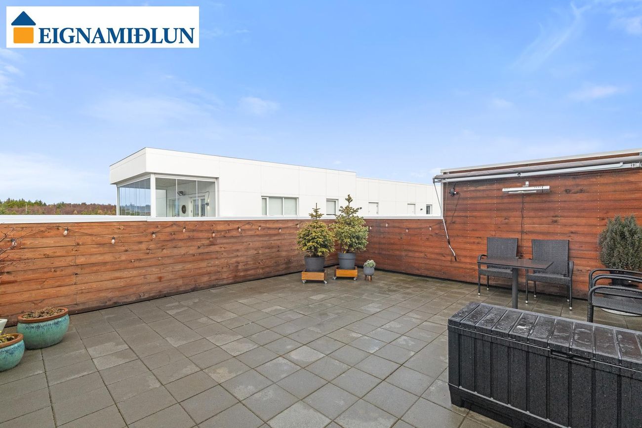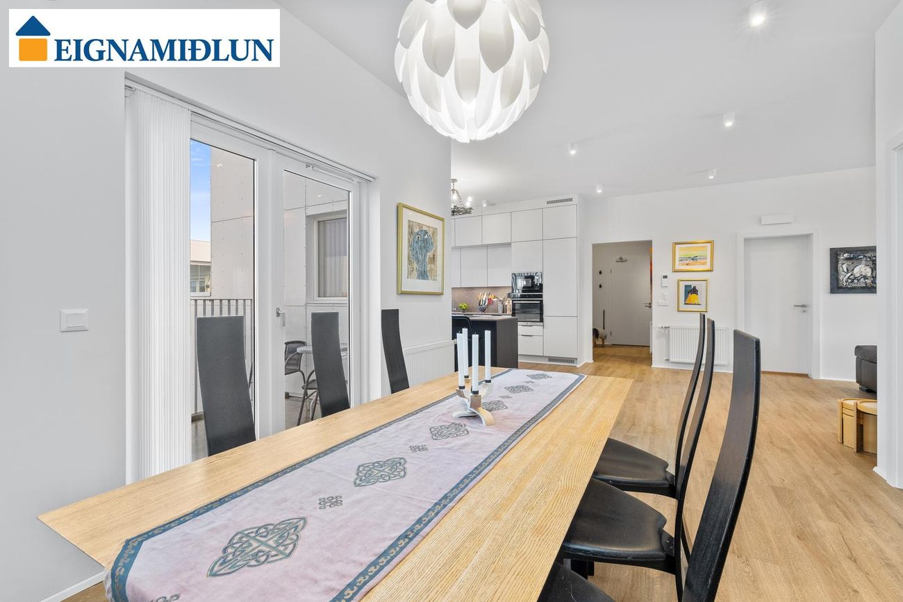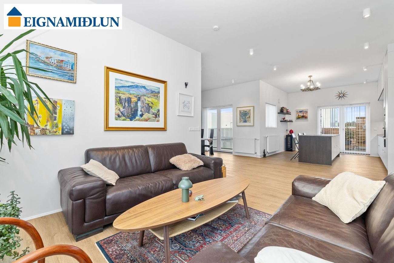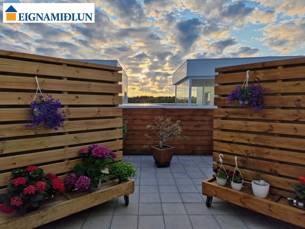 Glæsileg íbúð á efstu hæð með stórum þaksvölum.Fjögurra til fimm herbergja samtals 160,5m² íbúð á efstu hæð með þrennum svölum þar af einum stórum 45fm þaksvölum sem ná suður og vesturátt. Bílskúr fylgir (24,5m²) ásamt stæði í lokaðri bílageymslu. Aukin lofthæð eða 2,9 m. Vandaðar innréttingar eru í allri íbúðinni sem ná allar upp i loft, framleiðandi er VOKE-III.