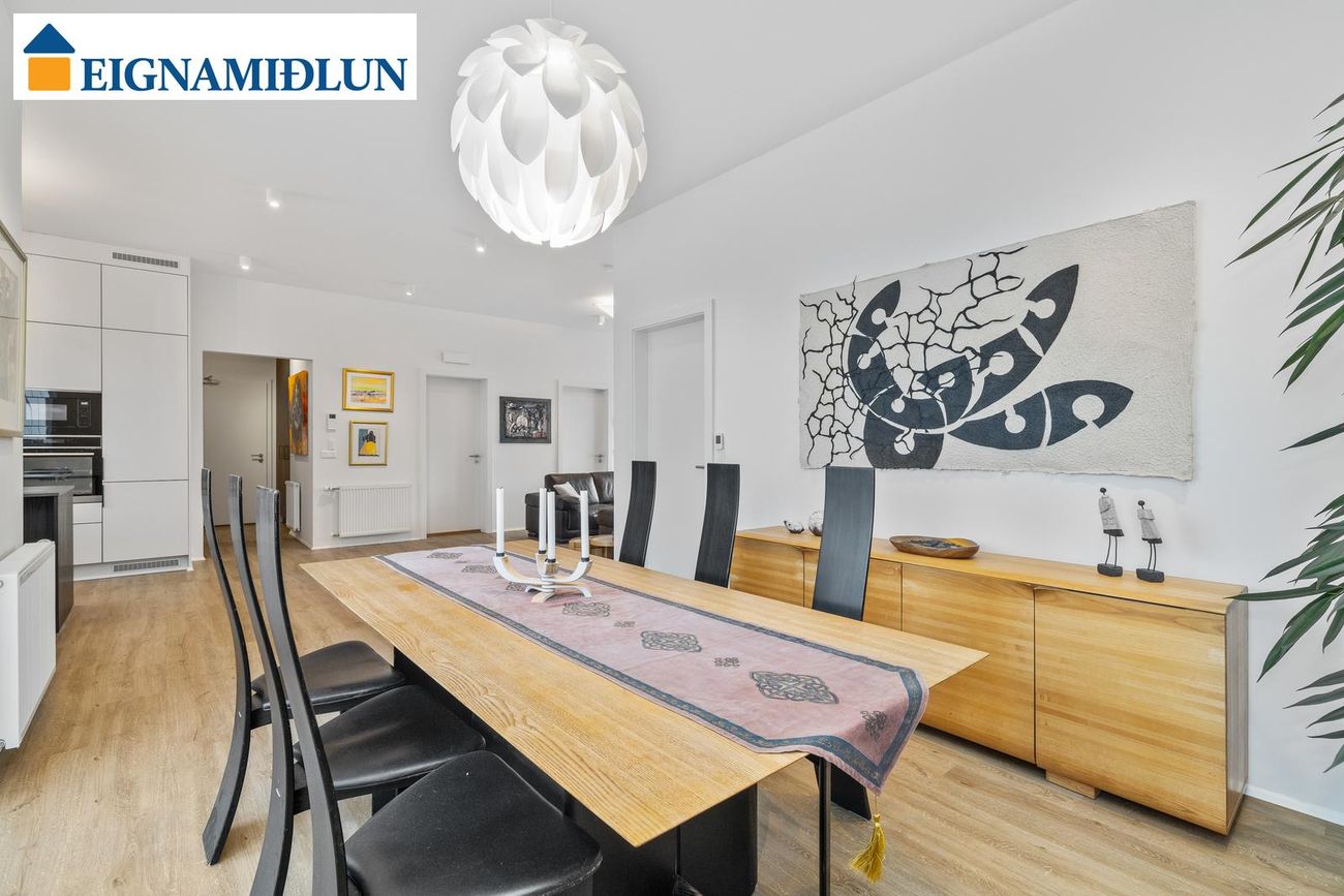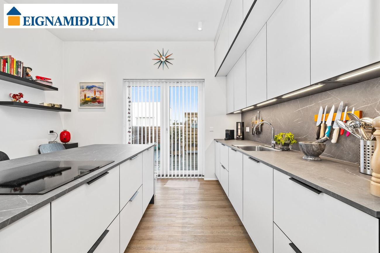 Eldhús, stofa og borðstofa eru í stóru samliggjandi rými. Í Eldhúsi er stór eyja með helluborði. Innbyggður ísskápur og uppþvottavél í innréttingu. Bakarofn og örbylgjuofn í vinnuhæð. Frá eldhúsi er gengið út á