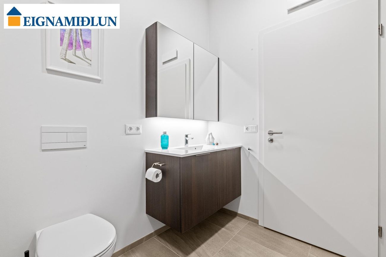 Gólfefni eru vandað vínilparket frá Agli Árnasyni og flísar á baðherbergjum.