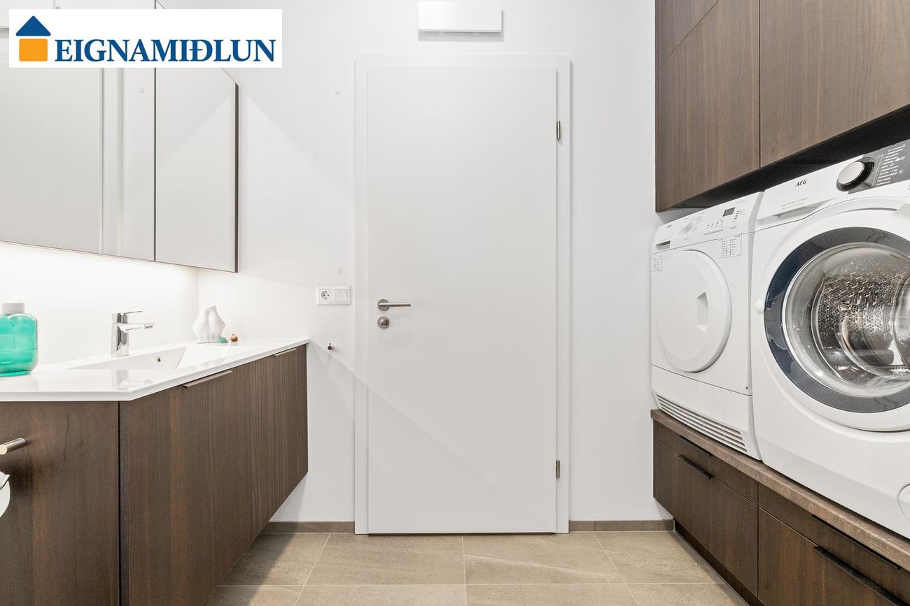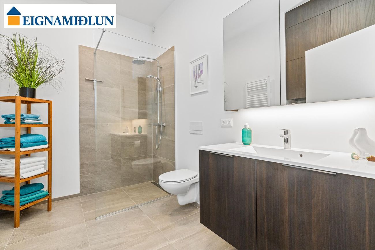 Aðalbaðherbergið er flísalagt á gólfi og veggum að hluta. Flísalögð sturta með glerskilrúmi og handklæðaofn. Innrétting fyrir þvottavél og þurrkara auk skápa.