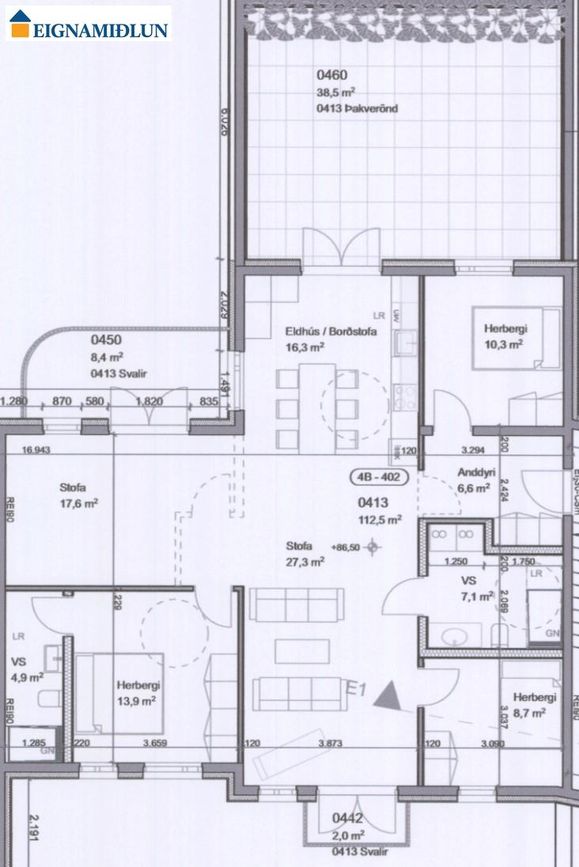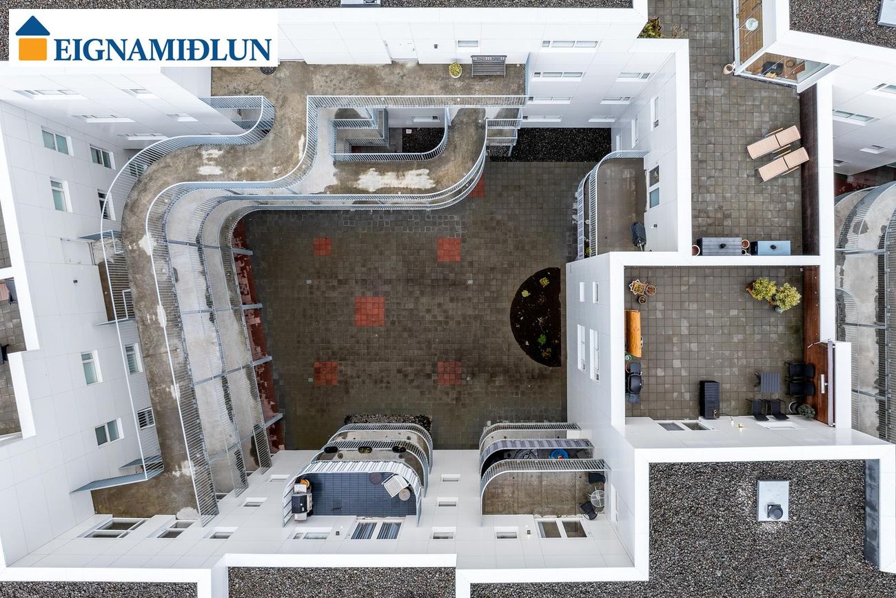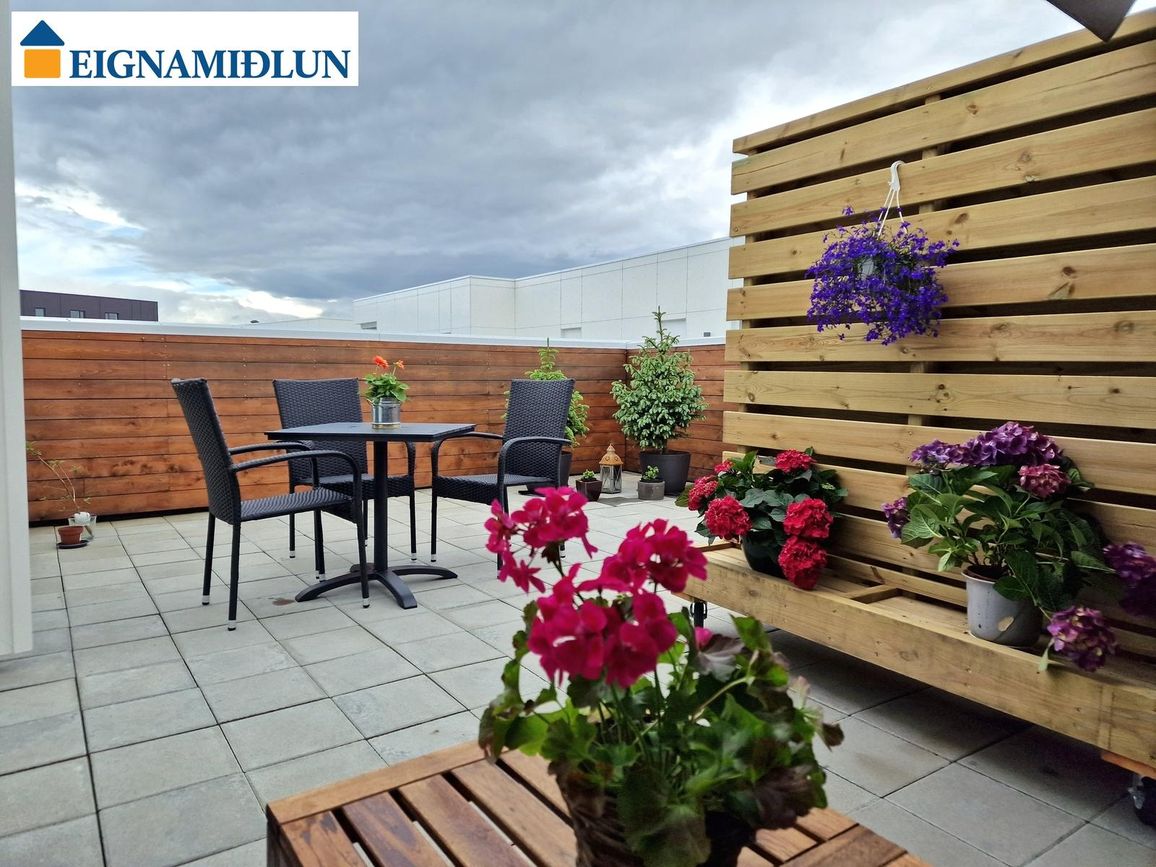 45m² þaksvalirBorðstofa er rúmgóð og þaðan er gengið út á svalir sem snúa inn í inngarðinn.